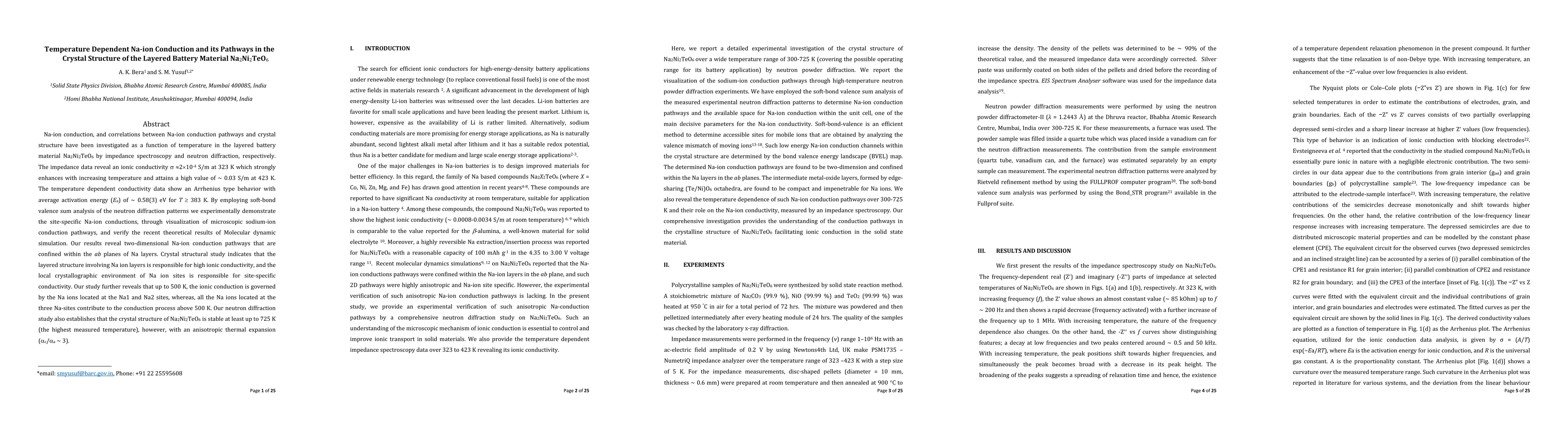 Na-ion conduction, and correlations between Na-ion conduction pathways and crystal structure have been investigated as a function of temperature in the layered battery material Na2Ni2TeO6 by impedance spectroscopy and neutron diffraction, respectively. The impedance data reveal an ionic conductivity 2x10-4 S/m at 323 K which strongly enhances with increasing temperature and attains a high value of ~ 0.03 S/m at 423 K. The temperature dependent conductivity data show an Arrhenius type behavior with average activation energy (Ea) of ~ 0.58(3) eV for T > 383 K. By employing soft-bond valence sum analysis of the neutron diffraction patterns we experimentally demonstrate the site-specific Na-ion conductions, through visualization of microscopic sodium-ion conduction pathways, and verify the recent theoretical results of Molecular dynamic simulation. Our results reveal two-dimensional Na-ion conduction pathways that are confined within the ab planes of Na layers. Crystal structural study indicates that the layered structure involving Na ion layers is responsible for high ionic conductivity, and the local crystallographic environment of Na ion sites is responsible for site-specific conductivity. Our study further reveals that up to 500 K, the ionic conduction is governed by the Na ions located at the Na1 and Na2 sites, whereas, all the Na ions located at the three Na-sites contribute to the conduction process above 500 K. Our neutron diffraction study also establishes that the crystal structure of Na2Ni2TeO6 is stable at least up to 725 K (the highest measured temperature), however, with an anisotropic thermal expansion (c/a ~ 3).