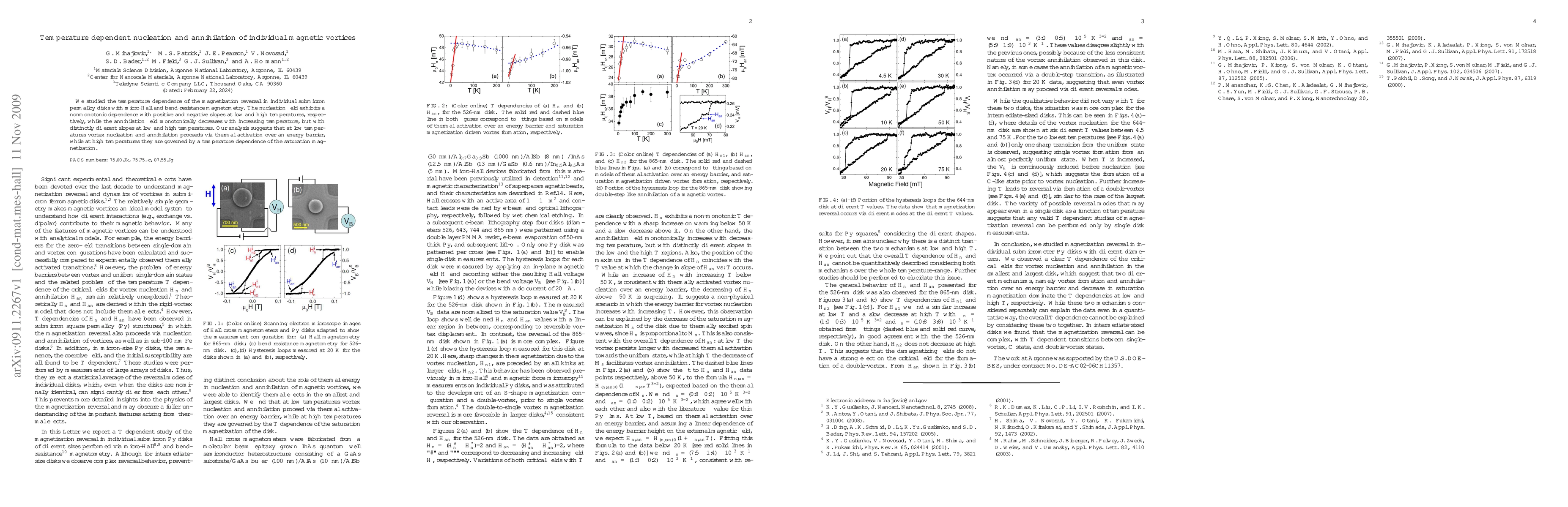 This study investigates the temperature-dependent magnetization reversal in submicron permalloy disks, revealing a nonmonotonic nucleation field and a monotonically decreasing annihilation field with temperature. At low temperatures, vortex processes are thermally activated, while at high temperatures, they are influenced by the temperature dependence of saturation magnetization.