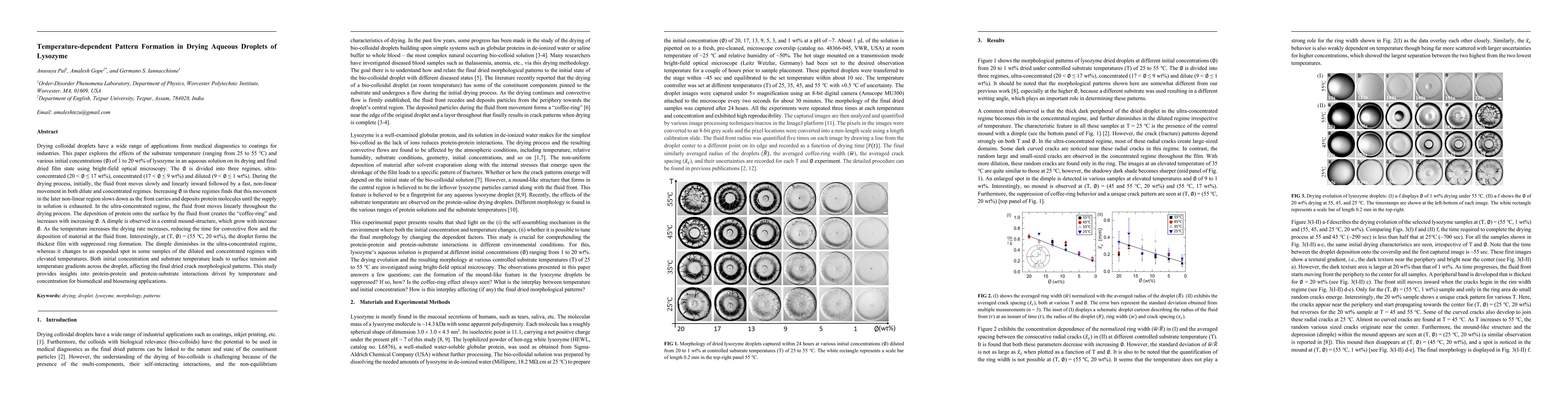 Drying colloidal droplets have a wide range of applications from medical diagnostics to coatings for industries. This paper explores the effects of the substrate temperature (ranging from $25$ to $55 ^{\circ}$C) and various initial concentrations ($\phi$) of $1$ to $20$ wt% of lysozyme in an aqueous solution on its drying and final dried film state using bright-field optical microscopy. The $\phi$ is divided into three regimes, ultra-concentrated ($20$ $<$ $\phi$ $\leq$ $17$ wt%), concentrated ($17$ $<$ $\phi$ $\leq$ $9$ wt%) and diluted ($9$ $<$ $\phi$ $\leq$ $1$ wt%). Increasing $\phi$ in these regimes finds that this movement in the later non-linear region slows down as the front carries and deposits protein molecules until the supply in solution is exhausted. In the ultra-concentrated regime, the fluid front moves linearly throughout the drying process. The deposition of protein onto the surface by the fluid front creates the "coffee-ring" and increases with increasing $\phi$. A dimple is observed in a central mound-structure, which grows with increasing $\phi$. As the temperature increases the drying rate increases, reducing the time for convective flow and the deposition of material at the fluid front. Interestingly, at (T, $\phi$) = ($55 ^{\circ}$C, $20$ wt%), the droplet forms the thickest film with suppressed ring formation. The dimple diminishes in the ultra-concentrated regime, whereas it changes to an expanded spot in some samples of the diluted and concentrated regimes with elevated temperatures. Both initial concentration and substrate temperature lead to surface tension and temperature gradients across the droplet, affecting the morphological patterns. This study provides insights into protein-protein and protein-substrate interactions driven by temperature and concentration for biomedical and biosensing applications.