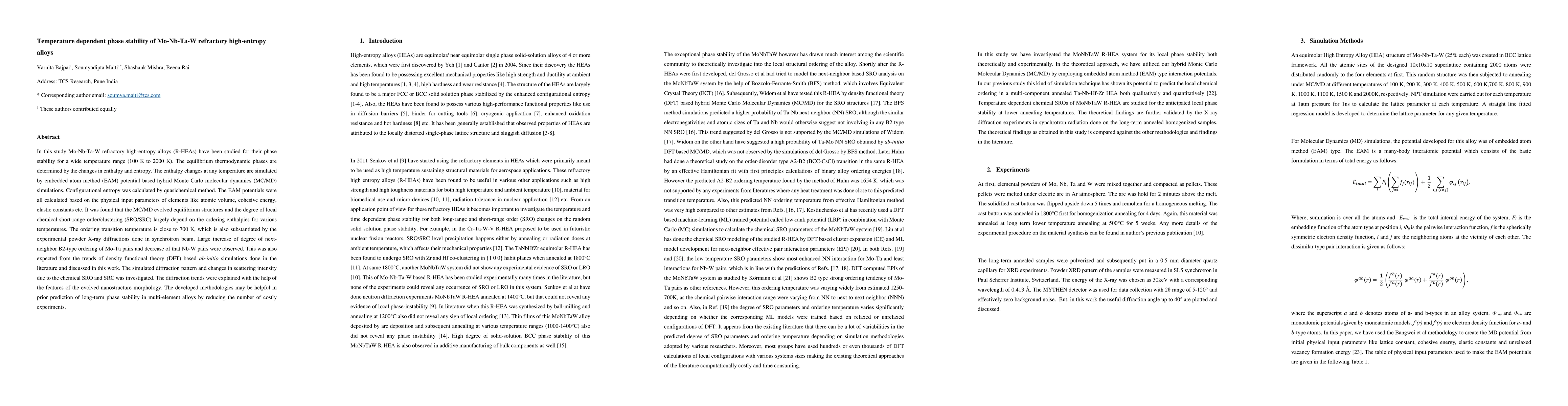 In this study Mo-Nb-Ta-W refractory high-entropy alloys (R-HEAs) have been studied for their phase stability for a wide temperature range (100 K to 2000 K). The equilibrium thermodynamic phases are determined by the changes in enthalpy and entropy. The enthalpy changes at any temperature are simulated by embedded atom method (EAM) potential based hybrid Monte Carlo molecular dynamics (MC/MD) simulations. Configurational entropy was calculated by quasichemical method. The EAM potentials were all calculated based on the physical input parameters of elements like atomic volume, cohesive energy, elastic constants etc. It was found that the MC/MD evolved equilibrium structures and the degree of local chemical short-range order/clustering (SRO/SRC) largely depend on the ordering enthalpies for various temperatures. The ordering transition temperature is close to 700 K, which is also substantiated by the experimental powder X-ray diffractions done in synchrotron beam. Large increase of degree of next-neighbor B2-type ordering of Mo-Ta pairs and decrease of that Nb-W pairs were observed. This was also expected from the trends of density functional theory (DFT) based ab-initio simulations done in the literature and discussed in this work. The simulated diffraction pattern and changes in scattering intensity due to the chemical SRO and SRC was investigated. The diffraction trends were explained with the help of the features of the evolved nanostructure morphology. The developed methodologies may be helpful in prior prediction of long-term phase stability in multi-element alloys by reducing the number of costly experiments.