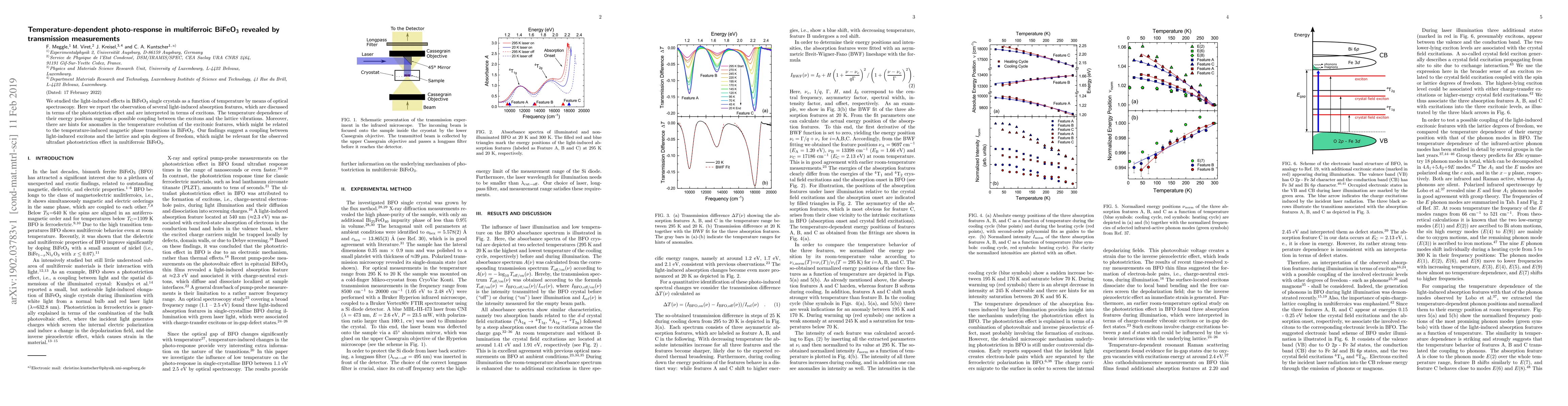 The study investigates the temperature-dependent photo-response in BiFeO$_3$ using optical spectroscopy, revealing light-induced absorption features linked to excitons and their interaction with lattice vibrations, suggesting a coupling relevant to ultrafast photostriction. The observed temperature-dependent anomalies hint at connections to magnetic phase transitions in the material.