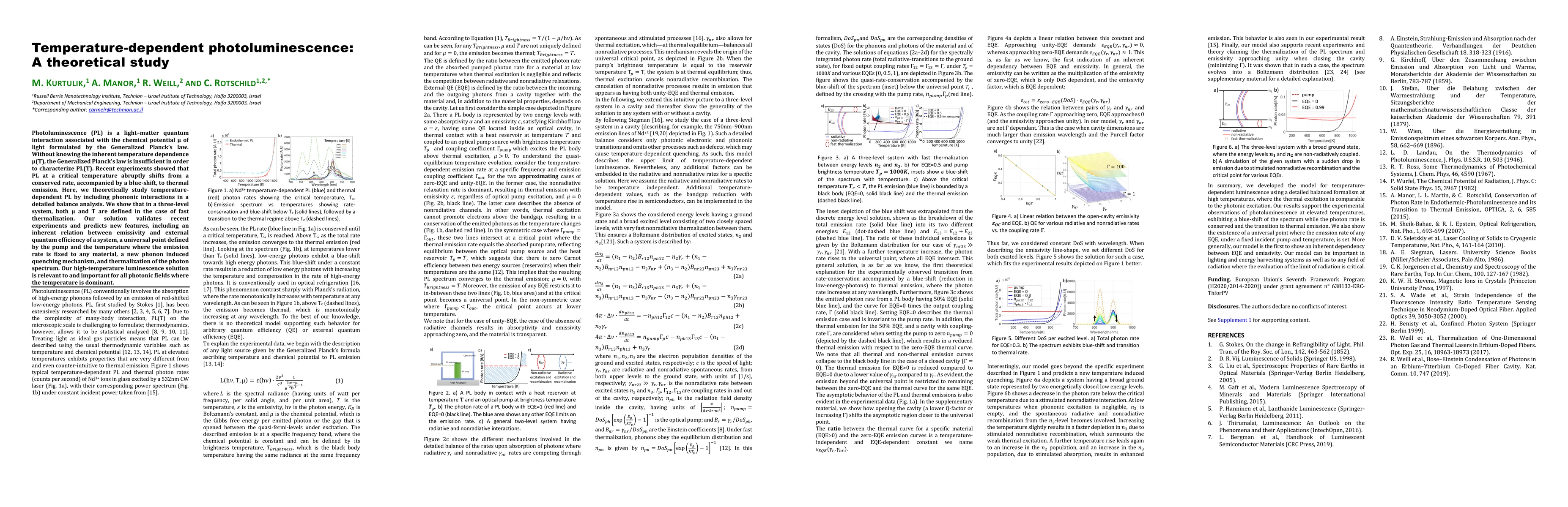 Photoluminescence (PL) is a light matter quantum interaction associated with the chemical potential of light formulated by the Generalized Planck's law. Without knowing the inherent temperature dependence of chemical potential, the Generalized Planck's law is insufficient in order to characterize PL vs. T. Recent experiments showed that PL at a critical temperature abruptly shifts from a conserved rate, accompanied by a blue-shift, to thermal emission. Here, we theoretically study temperature dependent PL by including phononic interactions in a detailed balance analysis. We show that in a three-level system, both chemical potential and T are defined in the case of fast thermalization. Our solution validates recent experiments and predicts new features, including an inherent relation between emissivity and external quantum efficiency of a system, a universal point defined by the pump and the temperature where the emission rate is fixed to any material, a new phonon induced quenching mechanism, and thermalization of the photon spectrum. Our high temperature luminescence solution is relevant to and important for all photonic fields where the temperature is dominant