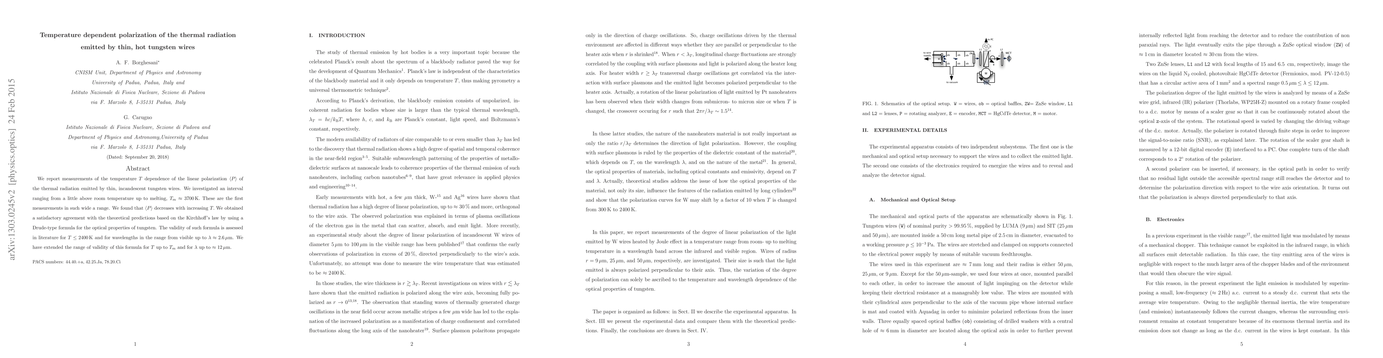 We report measurements of the temperature $T $ dependence of the linear polarization $\langle P\rangle $ of the thermal radiation emitted by thin, incandescent tungsten wires. We investigated an interval ranging from a little above room temperature up to melting, $T_m\approx 3700\,$K. These are the first measurements in such wide a range. We found that $\langle P\rangle $ decreases with increasing $T.$ We obtained a satisfactory agreement with the theoretical predictions based on the Kirchhoff's law by using a Drude-type formula for the optical properties of tungsten. The validity of such formula is assessed in literature for $T\leq 2400 \,$K and for wavelengths in the range from visible up to $\lambda\approx 2.6\,\mu$m. We have extended the range of validity of this formula for $T$ up to $T_m$ and for $\lambda$ up to $\approx 12\,\mu$m.