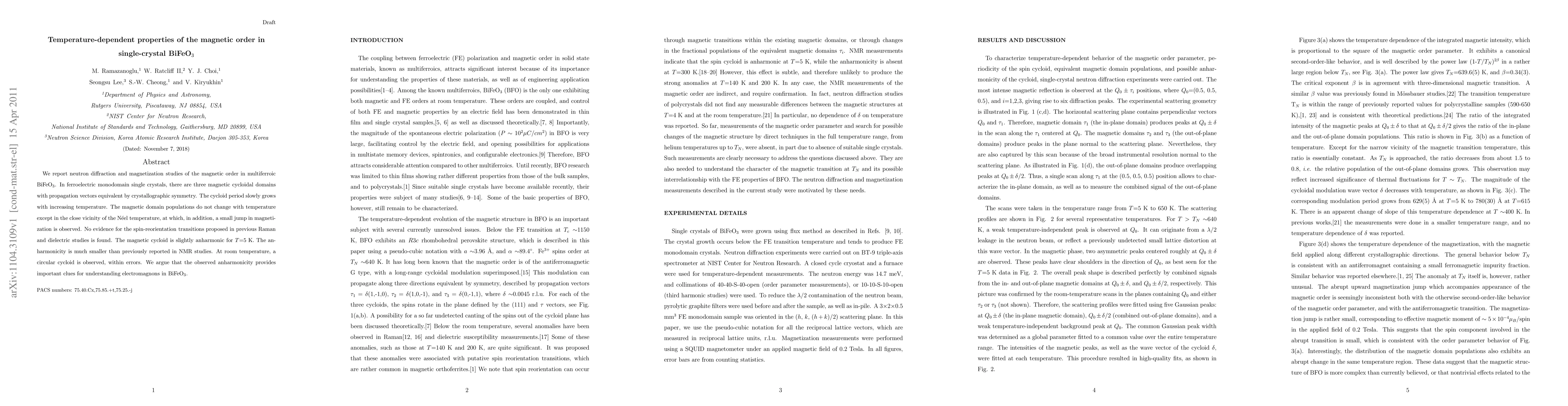 This study investigates the temperature-dependent magnetic order in BiFeO3 single crystals using neutron diffraction and magnetization. It reveals three magnetic cycloidal domains with a slowly increasing cycloid period with temperature, and no spin-reorientation transitions, providing insights into the anharmonicity of the magnetic cycloid and its implications for electromagnons.