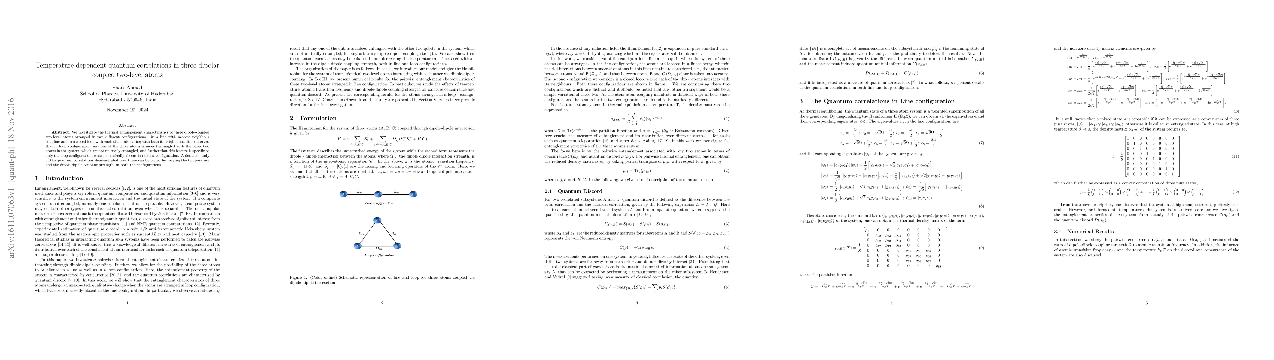 This paper explores thermal entanglement in three dipole-coupled two-level atoms in line and loop configurations, finding that only the loop configuration exhibits unique entanglement patterns. Quantum correlations in both configurations are shown to be tunable via temperature and coupling strength.