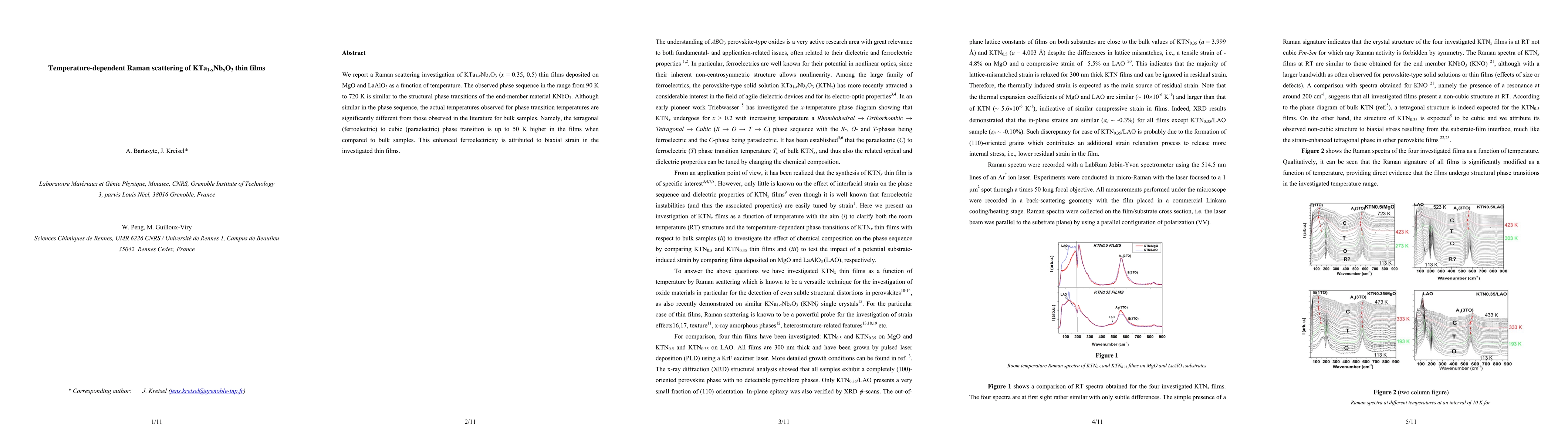 We report a Raman scattering investigation of KTa1-xNbxO3 (x = 0.35, 0.5) thin films deposited on MgO and LaAlO3 as a function of temperature. The observed phase sequence in the range from 90 K to 720 K is similar to the structural phase transitions of the end-member material KNbO3. Although similar in the phase sequence, the actual temperatures observed for phase transition temperatures are significantly different from those observed in the literature for bulk samples. Namely, the tetragonal (ferroelectric) to cubic (paraelectric) phase transition is up to 50 K higher in the films when compared to bulk samples. This enhanced ferroelectricity is attributed to biaxial strain in the investigated thin films.