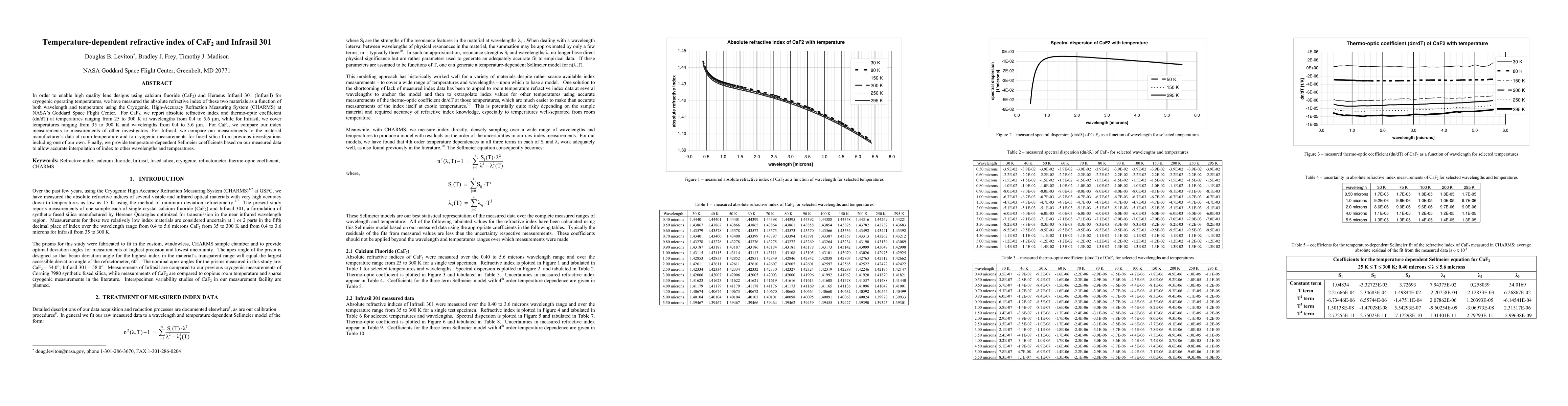 This paper reports the temperature-dependent refractive index measurements of CaF2 and Infrasil 301 from cryogenic to room temperatures, providing essential data for high-quality lens design in cryogenic applications. Temperature-dependent Sellmeier coefficients are also derived to facilitate accurate interpolation across different wavelengths and temperatures.