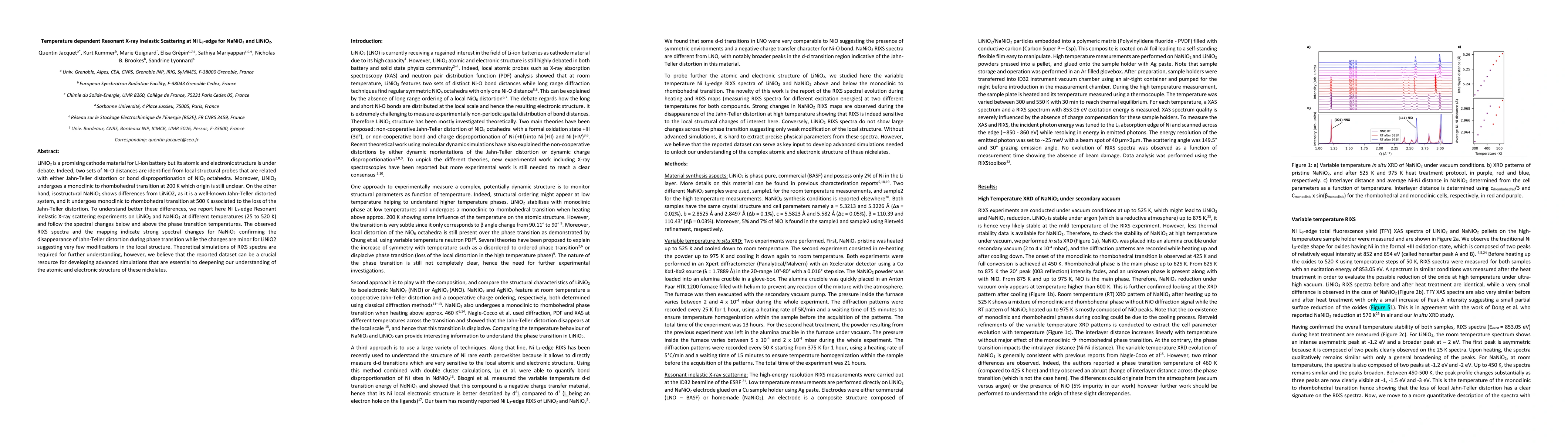 LiNiO2 is a promising cathode material for Li-ion battery but its atomic and electronic structure is under debate. Indeed, two sets of Ni-O distances are identified from local structural probes that are related with either Jahn-Teller distortion or bond disproportionation of NiO6 octahedra. Moreover, LiNiO2 undergoes a monoclinic to rhombohedral transition at 200 K which origin is still unclear. On the other hand, isostructural NaNiO2 shows differences from LiNiO2, as it is a well-known Jahn-Teller distorted system, and it undergoes monoclinic to rhombohedral transition at 500 K associated to the loss of the Jahn-Teller distortion. To understand better these differences, we report here Ni L3-edge Resonant inelastic X-ray scattering experiments on LiNiO2 and NaNiO2 at different temperatures (25 to 520 K) and follow the spectral changes below and above the phase transition temperatures. The observed RIXS spectra and the mapping indicate strong spectral changes for NaNiO2 confirming the disappearance of Jahn-Teller distortion during phase transition while the changes are minor for LiNiO2 suggesting very few modifications in the local structure. Theoretical simulations of RIXS spectra are required for further understanding, however, we believe that the reported dataset can be a crucial resource for developing advanced simulations that are essential to deepening our understanding of the atomic and electronic structure of these nickelates.