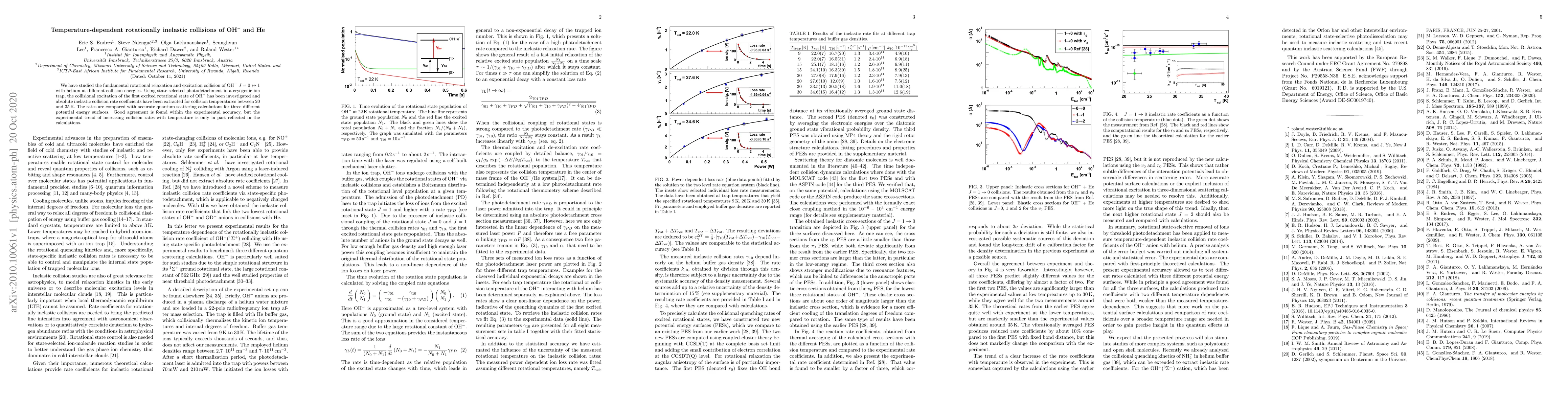 This study investigates the rotational relaxation and excitation of OH- (J=0 <-> 1) with helium at varying collision temperatures, using state-selected photodetachment in a cryogenic ion trap. The research finds good agreement between experimental inelastic collision rates and quantum scattering calculations, though discrepancies exist in the temperature dependence trend.