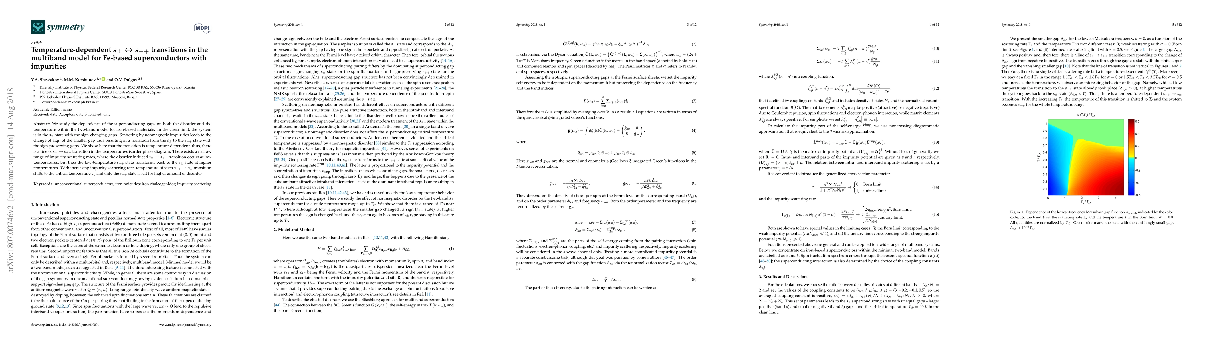 This paper investigates how temperature affects the transition between $s_\pm$ and $s_{++}$ superconducting states in a two-band model for Fe-based superconductors with impurities. It finds that impurity scattering can induce a transition from $s_\pm$ to $s_{++}$, which is temperature-dependent, leading to a complex interplay between disorder, temperature, and superconducting gap states.