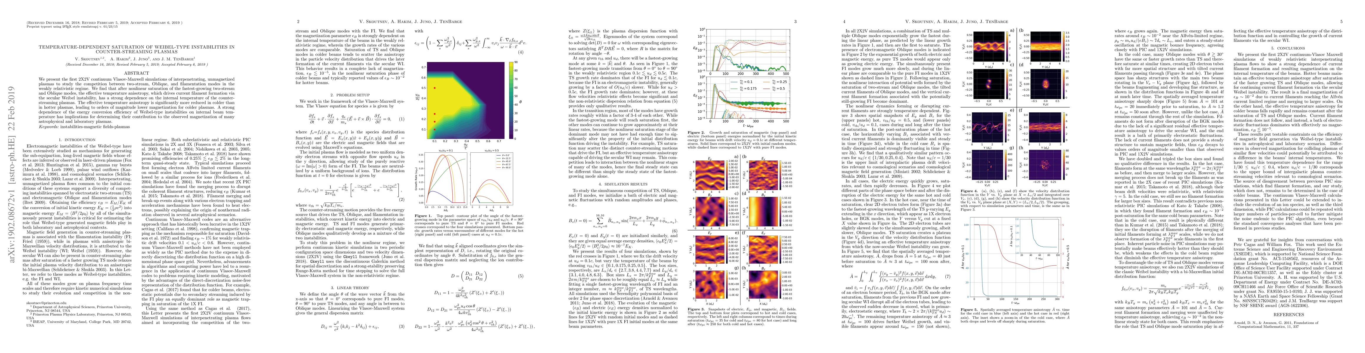 We present the first 2X2V continuum Vlasov-Maxwell simulations of interpenetrating, unmagnetized plasmas to study the competition between two-stream, Oblique, and filamentation modes in the weakly relativistic regime. We find that after nonlinear saturation of the fastest-growing two-stream and Oblique modes, the effective temperature anisotropy, which drives current filament formation via the secular Weibel instability, has a strong dependence on the internal temperature of the counter-streaming plasmas. The effective temperature anisotropy is significantly more reduced in colder than in hotter plasmas, leading to orders of magnitude lower magnetization for colder plasmas. A strong dependence of the energy conversion efficiency of Weibel-type instabilities on internal beam temperature has implications for determining their contribution to the observed magnetization of many astrophysical and laboratory plasmas.
