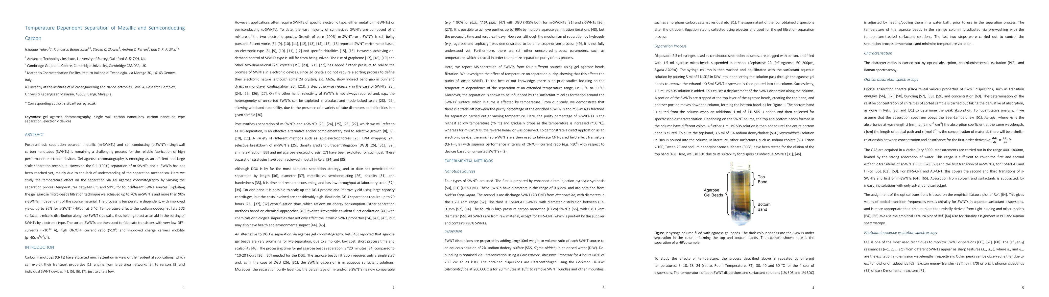 This study investigates the temperature-dependent separation of metallic and semiconducting single-wall carbon nanotubes (SWNTs) using gel agarose chromatography, achieving up to 70% metallic and over 90% semiconducting SWNTs. Temperature influences the SDS surfactant-micelle distribution, enhancing the sorting process and enabling the fabrication of transistors with superior electronic properties.