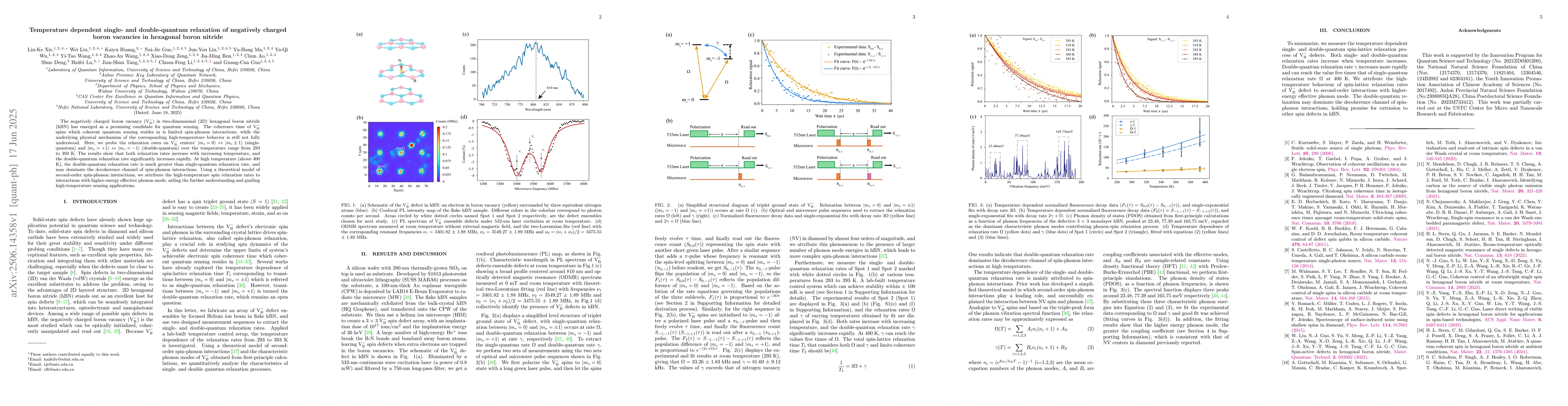 This study investigates temperature-dependent single- and double-quantum relaxation rates of negatively charged boron vacancies in hexagonal boron nitride, a promising material for quantum sensing. The research reveals that both relaxation rates rise with temperature, with the double-quantum rate increasing significantly faster. Above 400 K, the double-quantum relaxation surpasses single-quantum relaxation, potentially dominating spin-phonon interaction decoherence. A theoretical model attributes high-temperature spin relaxation to interactions with higher-energy phonon modes, enhancing understanding for high-temperature sensing applications.