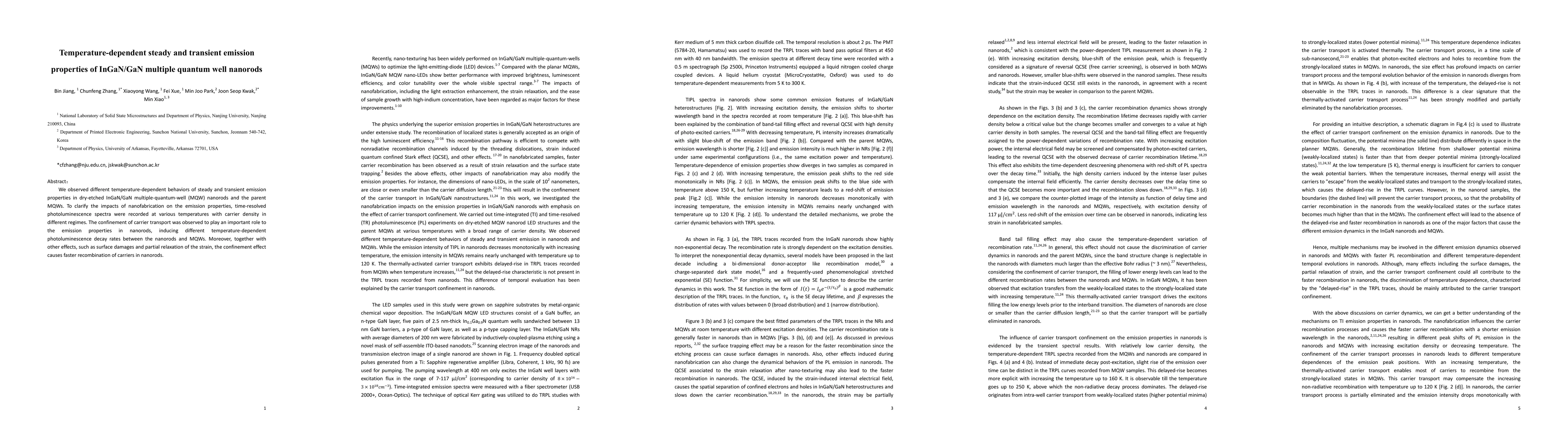 This study investigates the temperature-dependent steady and transient emission properties of InGaN/GaN MQW nanorods, revealing that nanofabrication significantly influences emission behaviors. Nanorods exhibit faster carrier recombination and distinct photoluminescence decay rates compared to parent MQWs, attributed to confinement effects, surface damages, and strain relaxation.