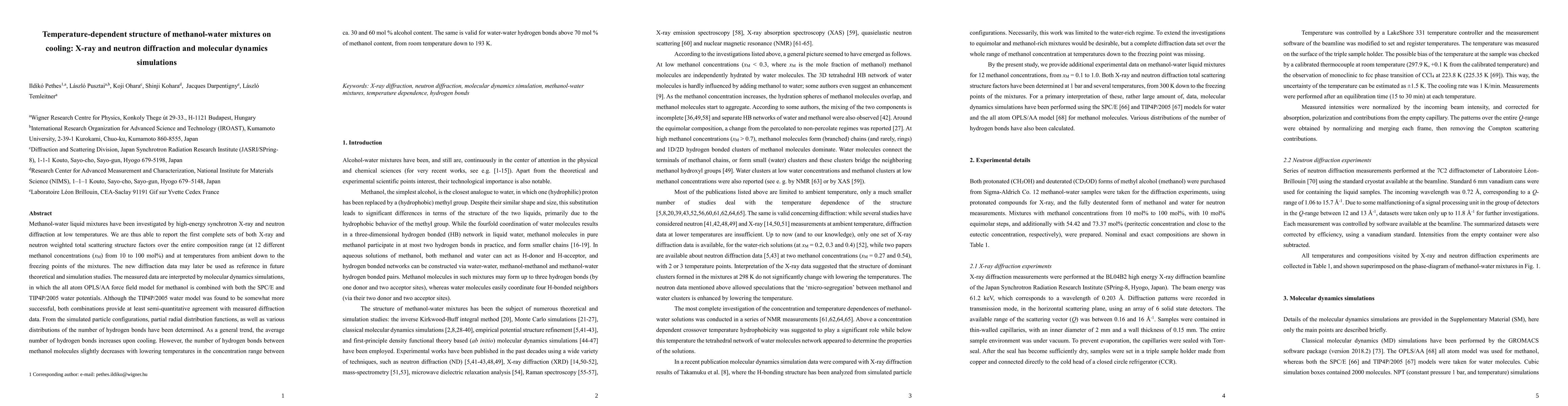 This study investigates methanol-water mixtures using synchrotron X-ray and neutron diffraction at low temperatures, providing comprehensive structure factors over various methanol concentrations. Molecular dynamics simulations using OPLS/AA force fields and SPC/E/TIP4P water models show semi-quantitative agreement with the diffraction data, revealing an increase in hydrogen bonds with cooling, except for methanol-methanol and water-water bonds in specific concentration ranges.