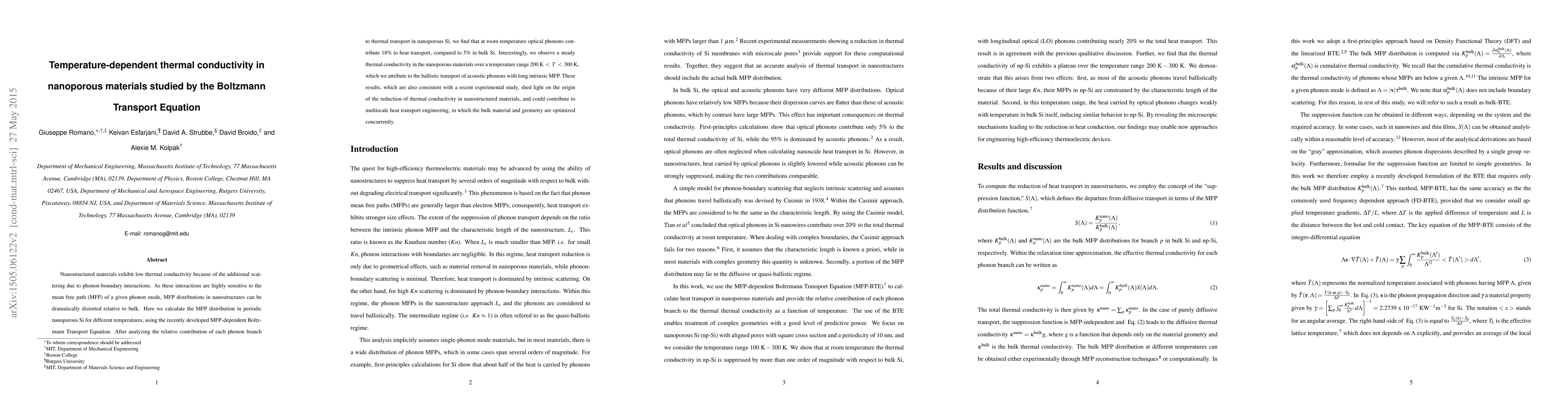 Nanostructured materials exhibit low thermal conductivity because of the additional scattering due to phonon-boundary interactions. As these interactions are highly sensitive to the mean free path (MFP) of a given phonon mode, MFP distributions in nanostructures can be dramatically distorted relative to bulk. Here we calculate the MFP distribution in periodic nanoporous Si for different temperatures, using the recently developed MFP-dependent Boltzmann Transport Equation. After analyzing the relative contribution of each phonon branch to thermal transport in nanoporous Si, we find that at room temperature optical phonons contribute 18 % to heat transport, compared to 5% in bulk Si. Interestingly, we observe a steady thermal conductivity in the nanoporous materials over a temperature range 200 K < T < 300 K, which we attribute to the ballistic transport of acoustic phonons with long intrinsic MFP. These results, which are also consistent with a recent experimental study, shed light on the origin of the reduction of thermal conductivity in nanostructured materials, and could contribute to multiscale heat transport engineering, in which the bulk material and geometry are optimized concurrently.