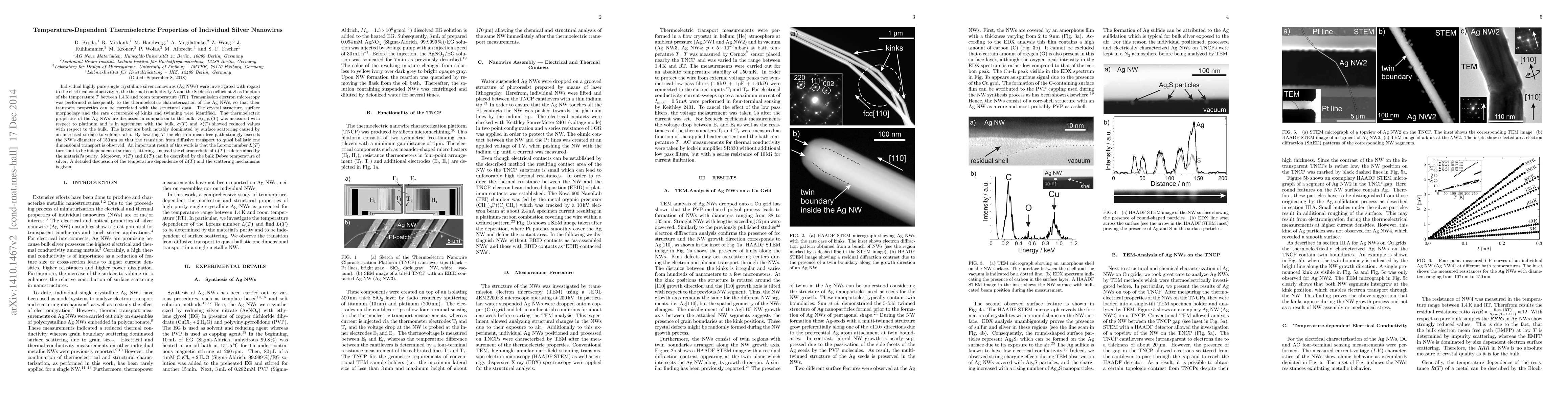 Individual highly pure single crystalline silver nanowires (Ag NWs) were investigated with regard to the electrical conductivity $\sigma$, the thermal conductivity $\lambda$ and the Seebeck coefficient $S$ as function of the temperature $T$ between $1.4\,\mathrm{K}$ and room temperature (RT). Transmission electron microscopy was performed subsequently to the thermoelectric characterization of the Ag NWs, so that their transport properties can be correlated with the structural data. The crystal structure, surface morphology and the rare occurrence of kinks and twinning were identified. The thermoelectric properties of the Ag NWs are discussed in comparison to the bulk: $S_{\mathrm{Ag,Pt}}(T)$ was measured with respect to platinum and is in agreement with the bulk, $\sigma(T)$ and $\lambda(T)$ showed reduced values with respect to the bulk. The latter are both notably dominated by surface scattering caused by an increased surface-to-volume ratio. By lowering $T$ the electron mean free path strongly exceeds the NW's diameter of $150\,\mathrm{nm}$ so that the transition from diffusive transport to quasi ballistic one dimensional transport is observed. An important result of this work is that the Lorenz number $L(T)$ turns out to be independent of surface scattering. Instead the characteristic of $L(T)$ is determined by the material's purity. Moreover, $\sigma(T)$ and $L(T)$ can be described by the bulk Debye temperature of silver.