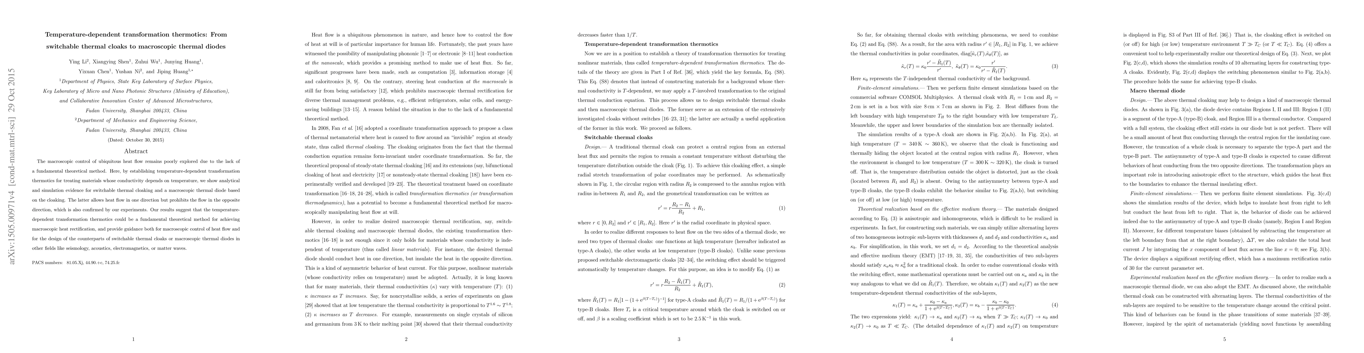 This research introduces temperature-dependent transformation thermotics, a method to control heat flow macroscopically. It demonstrates switchable thermal cloaking and a one-way heat flow device (thermal diode) via analytical, simulation, and experimental evidence, suggesting potential applications in various fields.