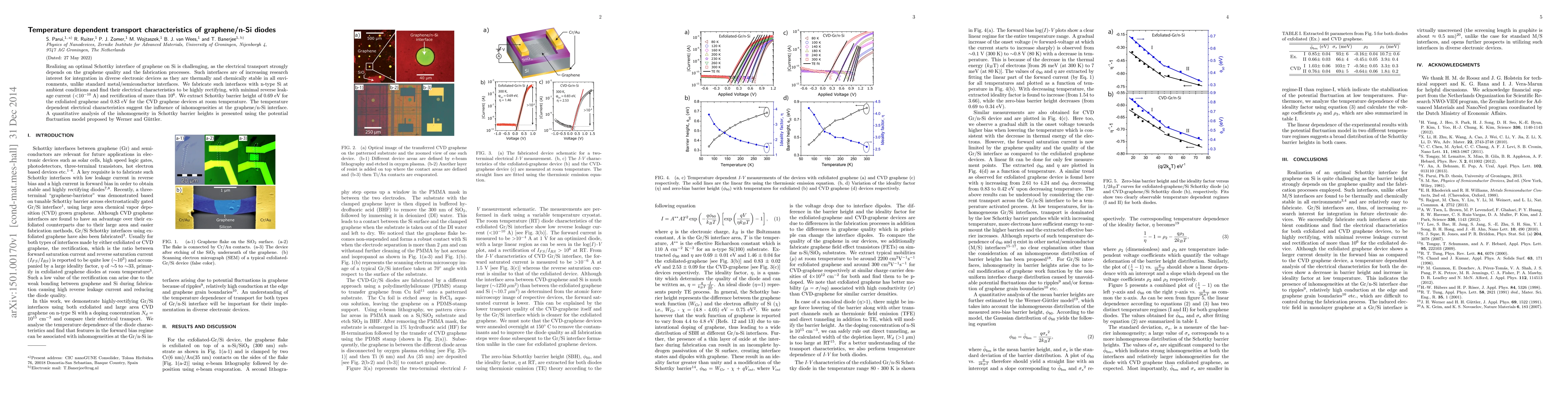 This study investigates the temperature-dependent electrical characteristics of graphene/n-Si diodes, revealing highly rectifying behavior with minimal reverse leakage current and large rectification ratios. The analysis highlights the impact of interface inhomogeneities on Schottky barrier heights, modeled quantitatively using the potential fluctuation model.