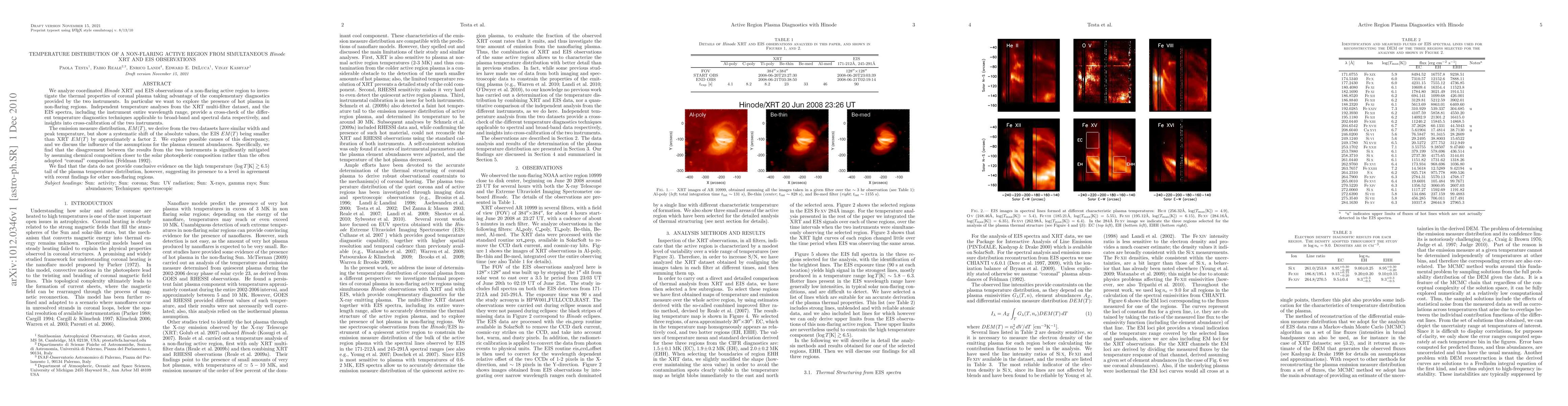 We analyze coordinated Hinode XRT and EIS observations of a non-flaring active region to investigate the thermal properties of coronal plasma taking advantage of the complementary diagnostics provided by the two instruments. In particular we want to explore the presence of hot plasma in non-flaring regions. Independent temperature analyses from the XRT multi-filter dataset, and the EIS spectra, including the instrument entire wavelength range, provide a cross-check of the different temperature diagnostics techniques applicable to broad-band and spectral data respectively, and insights into cross-calibration of the two instruments. The emission measure distribution, EM(T), we derive from the two datasets have similar width and peak temperature, but show a systematic shift of the absolute values, the EIS EM(T) being smaller than XRT EM(T) by approximately a factor 2. We explore possible causes of this discrepancy, and we discuss the influence of the assumptions for the plasma element abundances. Specifically, we find that the disagreement between the results from the two instruments is significantly mitigated by assuming chemical composition closer to the solar photospheric composition rather than the often adopted "coronal" composition (Feldman 1992). We find that the data do not provide conclusive evidence on the high temperature (log T[K] >~ 6.5) tail of the plasma temperature distribution, however, suggesting its presence to a level in agreement with recent findings for other non-flaring regions.