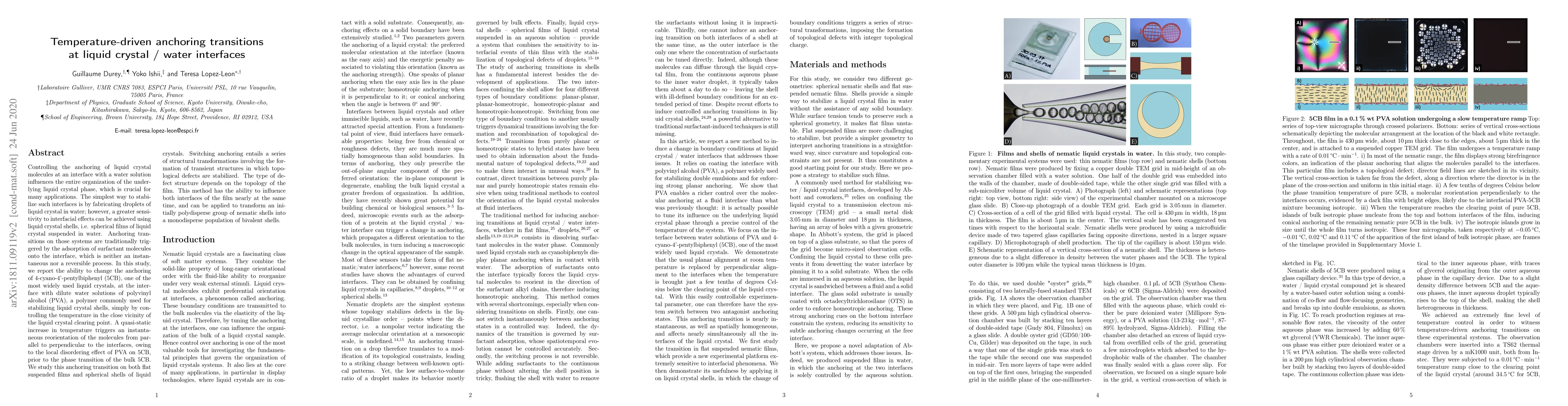 Controlling the anchoring of liquid crystal molecules at an interface with a water solution influences the entire organization of the underlying liquid crystal phase, which is crucial for many applications. The simplest way to stabilize such interfaces is by fabricating droplets of liquid crystal in water; however, a greater sensitivity to interfacial effects can be achieved using liquid crystal shells, i.e. spherical films of liquid crystal suspended in water. Anchoring transitions on those systems are traditionally triggered by the adsorption of surfactant molecules onto the interface, which is neither an instantaneous nor a reversible process. In this study, we report the ability to change the anchoring of 4-cyano-4'-pentylbiphenyl (5CB), one of the most widely used liquid crystals, at the interface with dilute water solutions of polyvinyl alcohol (PVA), a polymer commonly used for stabilizing liquid crystal shells, simply by controlling the temperature in the close vicinity of the liquid crystal clearing point. A quasi-static increase in temperature triggers an instantaneous reorientation of the molecules from parallel to perpendicular to the interfaces, owing to the local disordering effect of PVA on 5CB, prior to the phase transition of the bulk 5CB. We study this anchoring transition on both flat suspended films and spherical shells of liquid crystals. Switching anchoring entails a series of structural transformations involving the formation of transient structures in which topological defects are stabilized. The type of defect structure depends on the topology of the film. This method has the ability to influence both interfaces of the film nearly at the same time, and can be applied to transform an initially polydisperse group of nematic shells into a monodisperse population of bivalent shells.