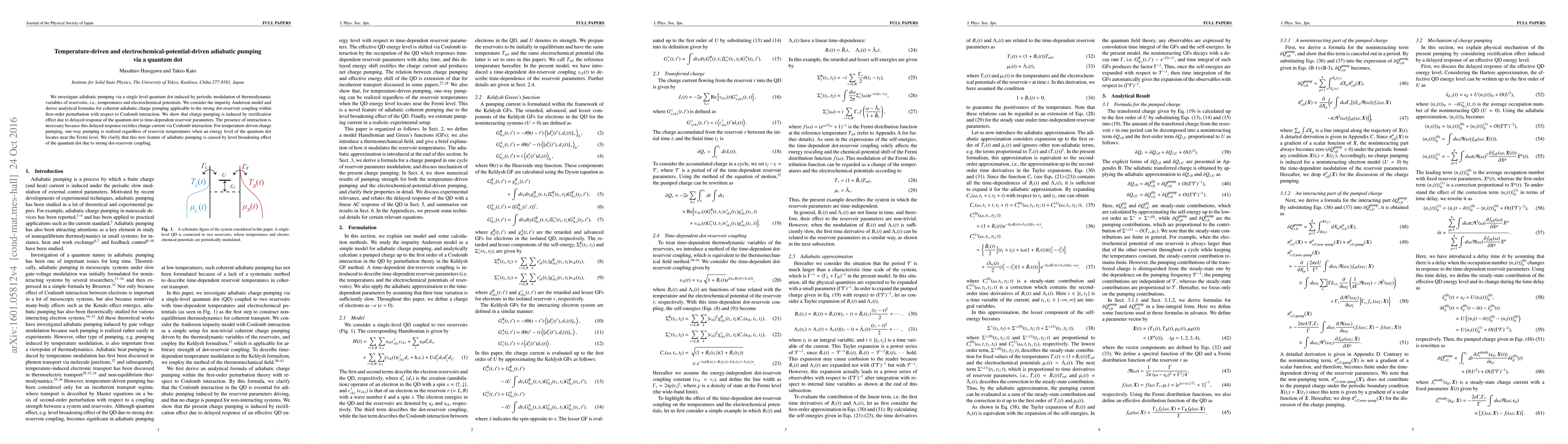 This research explores adiabatic charge pumping through a quantum dot under periodic modulation of temperature and electrochemical potentials, revealing a rectification effect due to the quantum dot's delayed response to time-dependent reservoir parameters. Analytical formulas are derived for coherent pumping, showing one-way charge pumping when the quantum dot's energy level is near the Fermi level, a result of the level broadening effect from strong coupling.