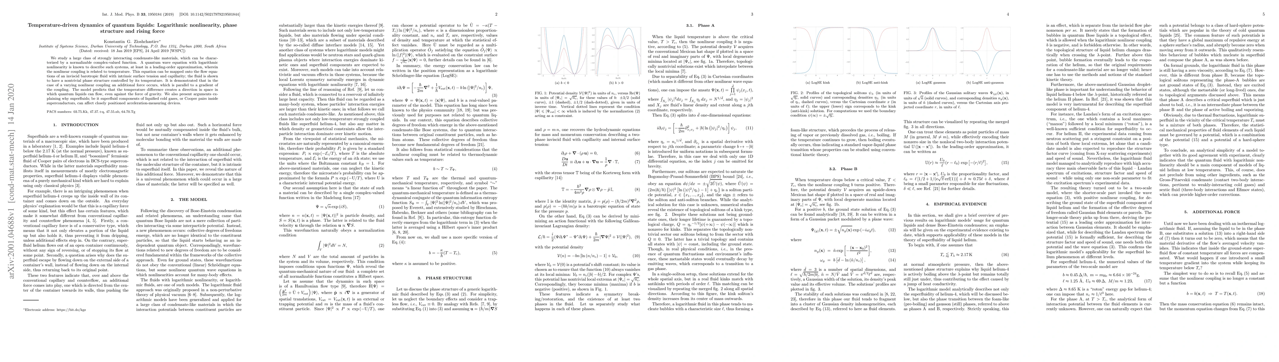 We study a large class of strongly interacting condensate-like materials, which can be characterized by a normalizable complex-valued function. A quantum wave equation with logarithmic nonlinearity is known to describe such systems, at least in a leading-order approximation, wherein the nonlinear coupling is related to temperature. This equation can be mapped onto the flow equations of an inviscid barotropic fluid with intrinsic surface tension and capillarity; the fluid is shown to have a nontrivial phase structure controlled by its temperature. It is demonstrated that in the case of a varying nonlinear coupling an additional force occurs, which is parallel to a gradient of the coupling. The model predicts that the temperature difference creates a direction in space in which quantum liquids can flow, even against the force of gravity. We also present arguments explaining why superfluids; be it superfluid components of liquified cold gases, or Cooper pairs inside superconductors, can affect closely positioned acceleration-measuring devices.