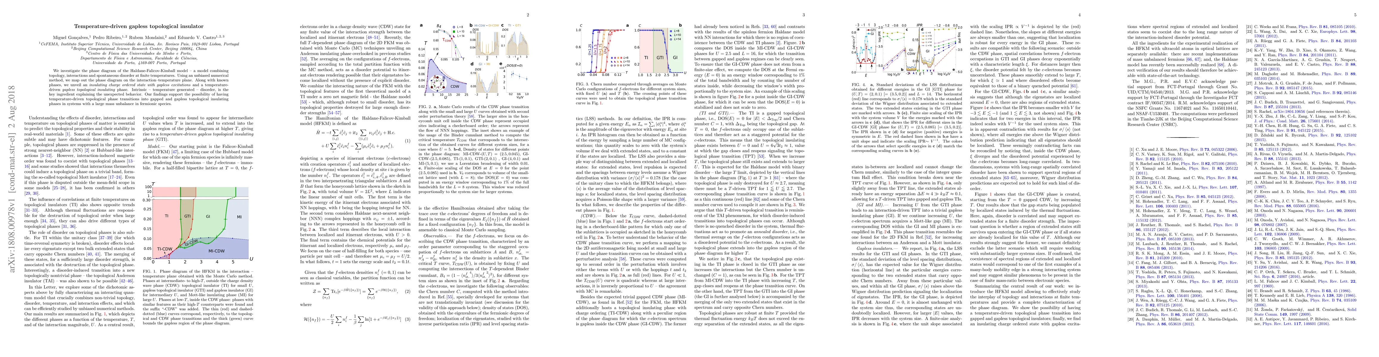 We investigate the phase diagram of the Haldane-Falicov-Kimball model -- a model combining topology, interactions and spontaneous disorder at finite temperatures. Using an unbiased numerical method, we map out the phase diagram on the interaction--temperature plane. Along with known phases, we unveil an \textit{insulating charge ordered state with gapless excitations }and a temperature-driven \textit{gapless topological insulating} phase. Intrinsic -- temperature generated -- disorder, is the key ingredient explaining the unexpected behavior. Our findings support the possibility of having temperature-driven topological phase transitions into gapped and gapless topological insulating phases in systems with a large mass unbalance in fermionic species.