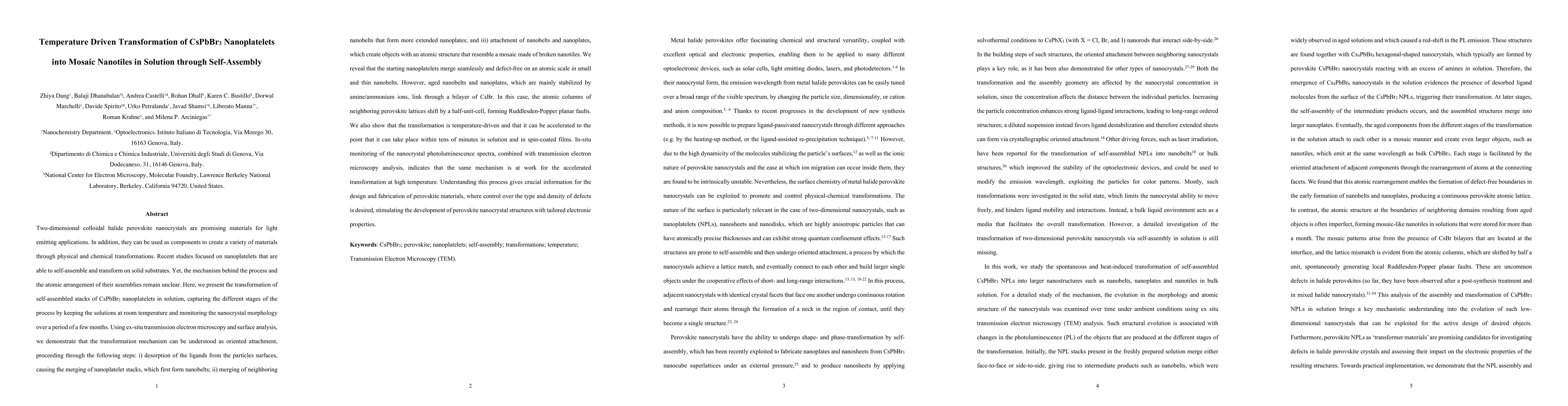 This study investigates the temperature-driven transformation of CsPbBr$_3$ nanoplatelets into mosaic nanotiles in solution via self-assembly, revealing an oriented attachment mechanism. The process involves ligand desorption, merging of nanoplatelets into nanobelts, and subsequent formation of extended nanoplates, ultimately creating mosaic-like structures with Ruddlesden-Popper planar faults in aged samples.