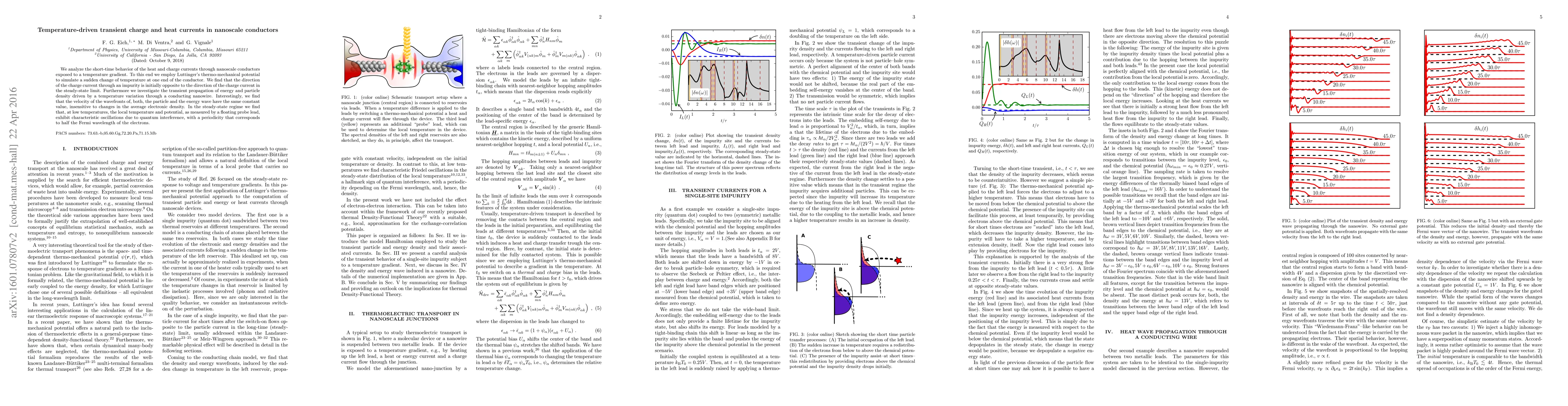 This paper investigates the transient behavior of heat and charge currents in nanoscale conductors under a temperature gradient, revealing that the initial charge current direction is opposite to the steady-state direction. It also finds that the wavefronts of particle and energy propagation have a constant velocity, unaffected by electronic density changes, and observes quantum interference-induced oscillations in local temperature and potential at low temperatures.