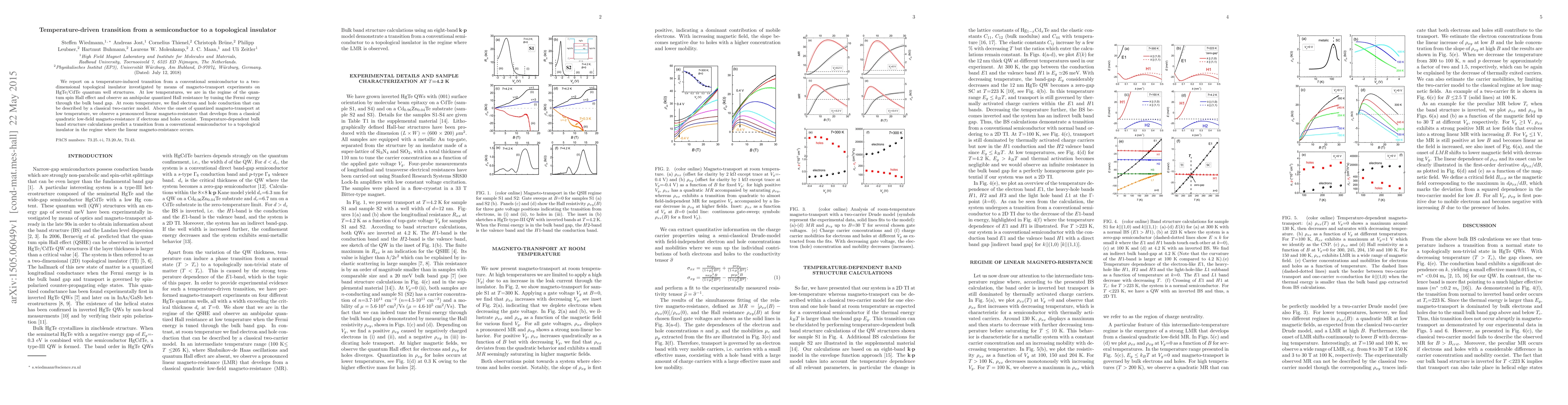 We report on a temperature-induced transition from a conventional semiconductor to a two-dimensional topological insulator investigated by means of magnetotransport experiments on HgTe/CdTe quantum well structures. At low temperatures, we are in the regime of the quantum spin Hall effect and observe an ambipolar quantized Hall resistance by tuning the Fermi energy through the bulk band gap. At room temperature, we find electron and hole conduction that can be described by a classical two-carrier model. Above the onset of quantized magnetotransport at low temperature, we observe a pronounced linear magnetoresistance that develops from a classical quadratic low-field magnetoresistance if electrons and holes coexist. Temperature-dependent bulk band structure calculations predict a transition from a conventional semiconductor to a topological insulator in the regime where the linear magnetoresistance occurs.