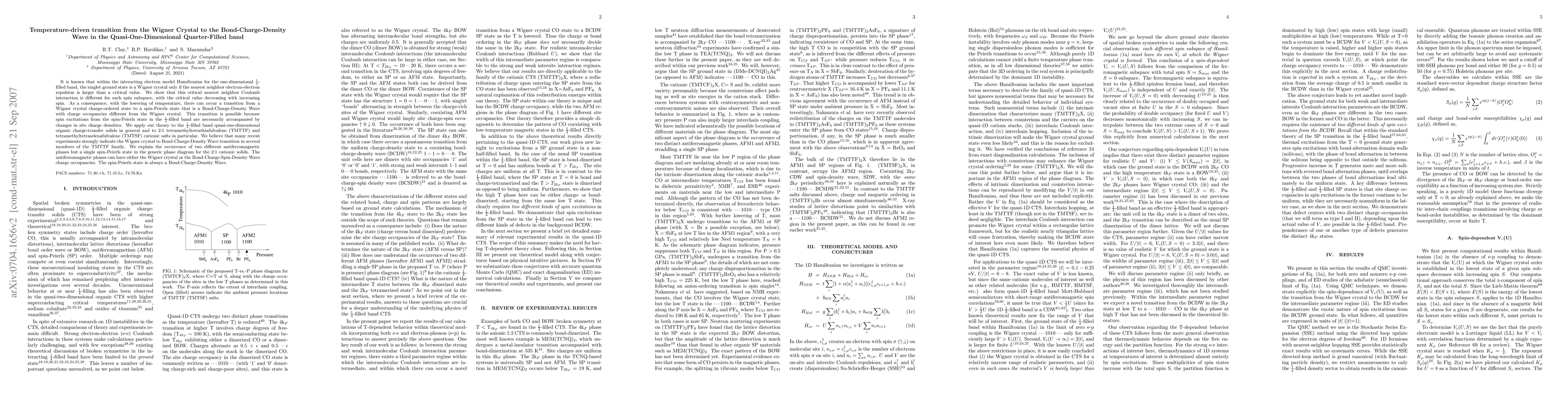 This paper investigates the temperature-driven transition from a Wigner crystal to a Bond-Charge-Density Wave in quasi-one-dimensional, quarter-filled electron bands, showing that different spin subspaces have distinct critical Coulomb interaction values. The transition is facilitated by spin excitations altering site charge densities, and is observed in organic charge-transfer solids like TMTTF and TMTSF cationic salts.