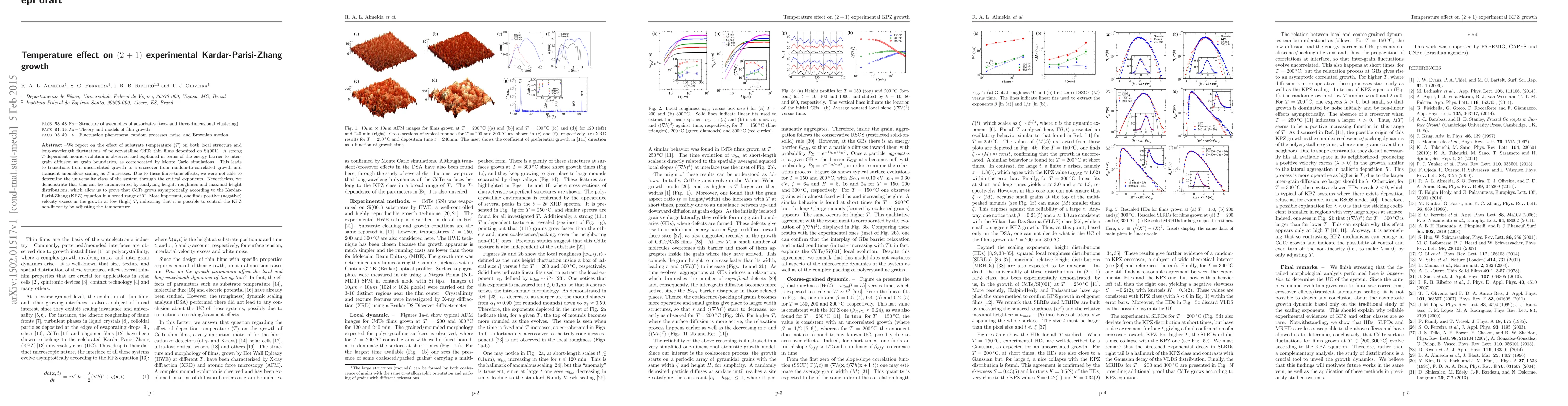 We report on the effect of substrate temperature (T) on both local structure and long-wavelength fluctuations of polycrystalline CdTe thin films deposited on Si(001). A strong T-dependent mound evolution is observed and explained in terms of the energy barrier to inter-grain diffusion at grain boundaries, as corroborated by Monte Carlo simulations. This leads to transitions from uncorrelated growth to a crossover from random-to-correlated growth and transient anomalous scaling as T increases. Due to these finite-time effects, we were not able to determine the universality class of the system through the critical exponents. Nevertheless, we demonstrate that this can be circumvented by analyzing height, roughness and maximal height distributions, which allow us to prove that CdTe grows asymptotically according to the Kardar-Parisi-Zhang (KPZ) equation in a broad range of T. More important, one finds positive (negative) velocity excess in the growth at low (high) T, indicating that it is possible to control the KPZ non-linearity by adjusting the temperature.
