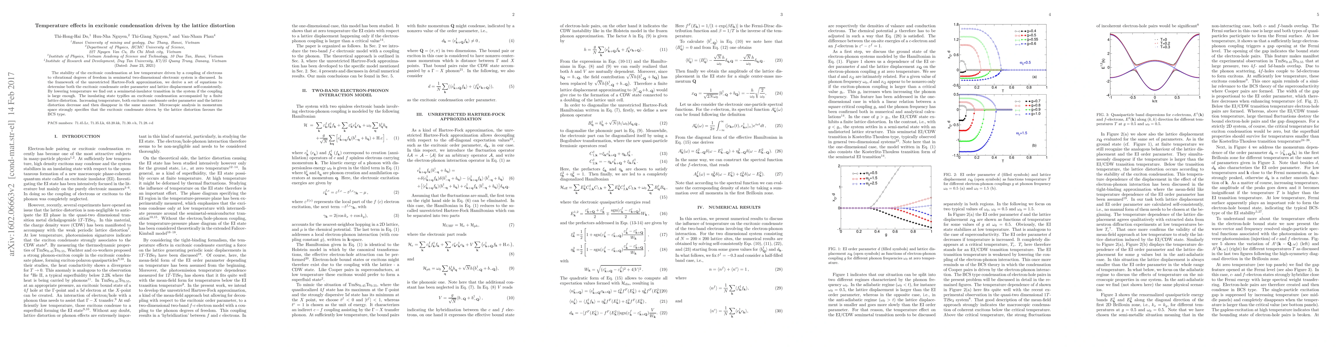 A research paper explores how temperature affects excitonic condensation in a semimetal system driven by lattice distortion, leading to a phase transition between an insulating state with finite lattice distortion and a normal state at higher temperatures.