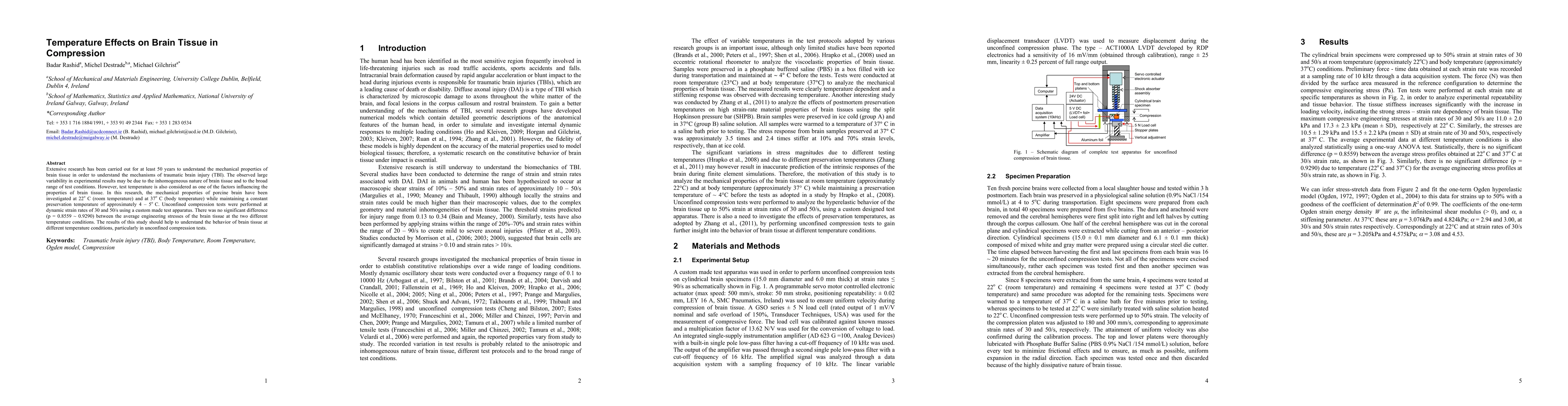This study investigates the mechanical properties of porcine brain tissue under unconfined compression at room temperature (22°C) and body temperature (37°C), finding no significant difference in average engineering stress between the two conditions. The results enhance understanding of brain tissue behavior in varying temperature scenarios.