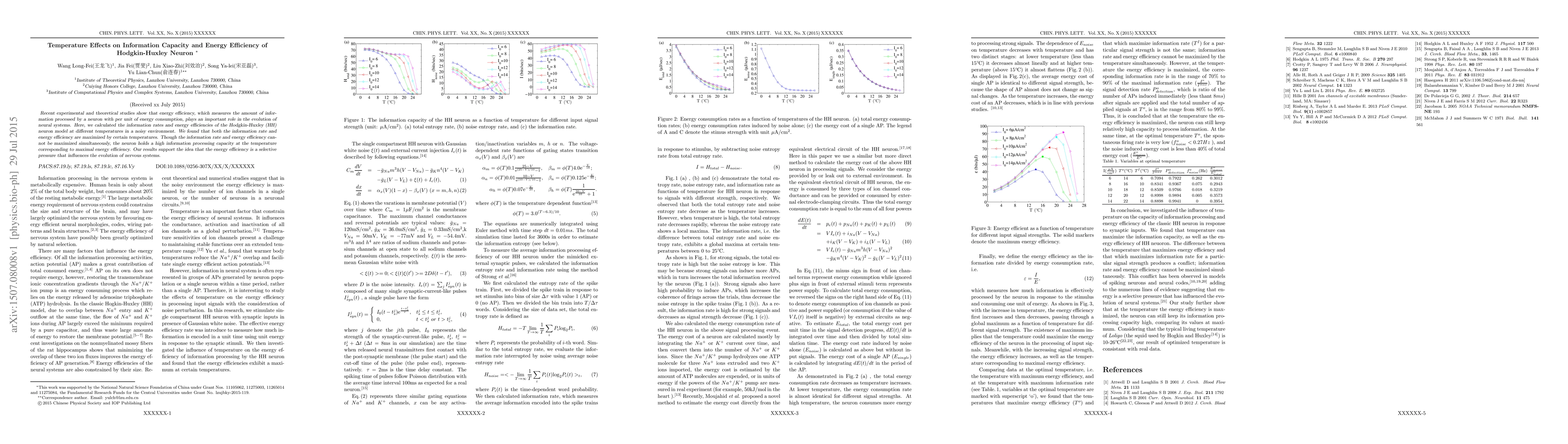 This paper investigates the temperature effects on the information capacity and energy efficiency of the Hodgkin-Huxley neuron model in a noisy environment, finding that both metrics are maximized at specific temperatures. The study concludes that while they cannot peak simultaneously, the neuron's information processing capacity is highest at the temperature of maximal energy efficiency, supporting the role of energy efficiency in neural evolution.