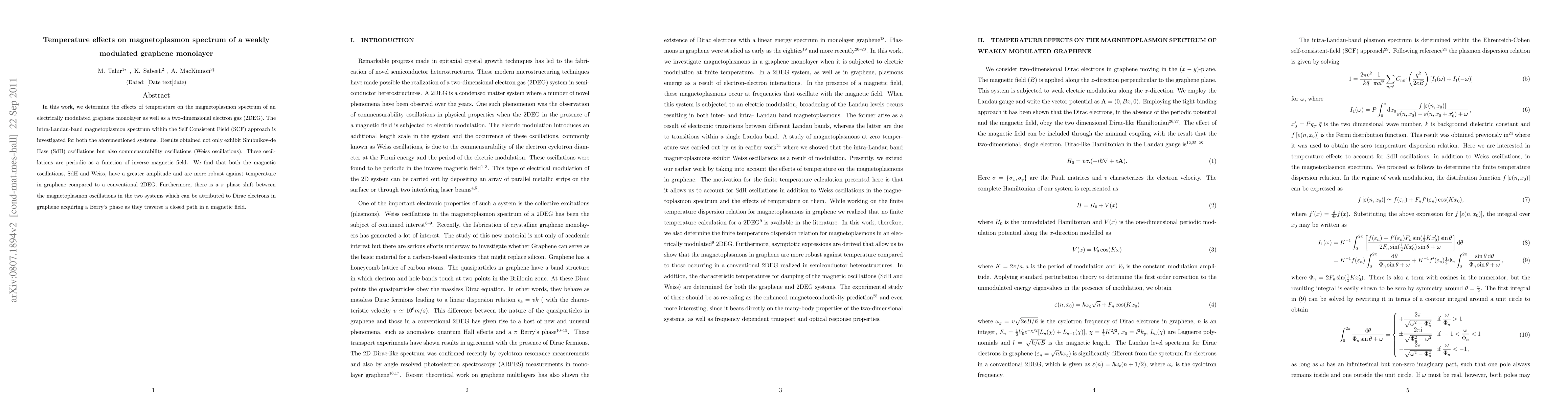 In this work, we determine the effects of temperature on the magnetoplasmon spectrum of an electrically modulated graphene monolayer as well as the two-dimensional electron gas (2DEG). The intra-Landau-band magnetoplasmon spectrum within the Self Consistent Field (SCF) approach is investigated for both the aforementioned systems. Results obtained not only exhibit Shubnikov-de Hass (SdH) oscillations but also commensurability oscillations (Weiss oscillations). These oscillations are periodic as a function of inverse magnetic field. We find that both the magnetic oscillations, SdH and Weiss, have a greater amplitude and are more robust against temperature in graphene compared to conventional 2DEG. Furthermore, there is a $\pi$ phase shift between the magnetoplasmon oscillations in the two systems which can be attributed to Dirac electrons in graphene acquiring a Berry's phase as they traverse a closed path in a magnetic field.