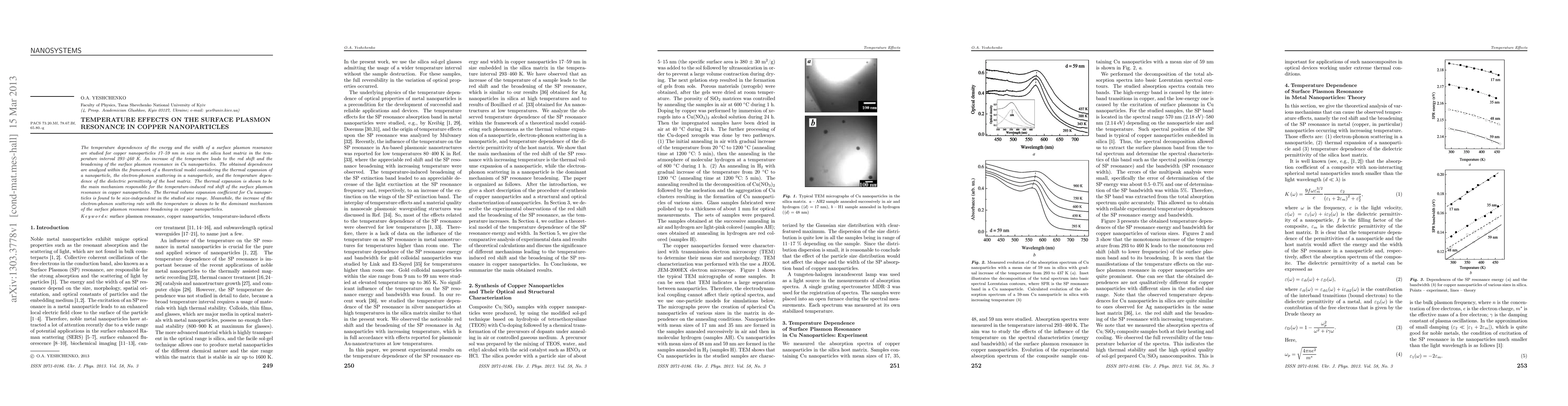 This study investigates how temperature affects the surface plasmon resonance in copper nanoparticles, finding a red shift and broadening with increased temperature. The main cause of the red shift is thermal expansion, while electron-phonon scattering primarily leads to broadening of the resonance.