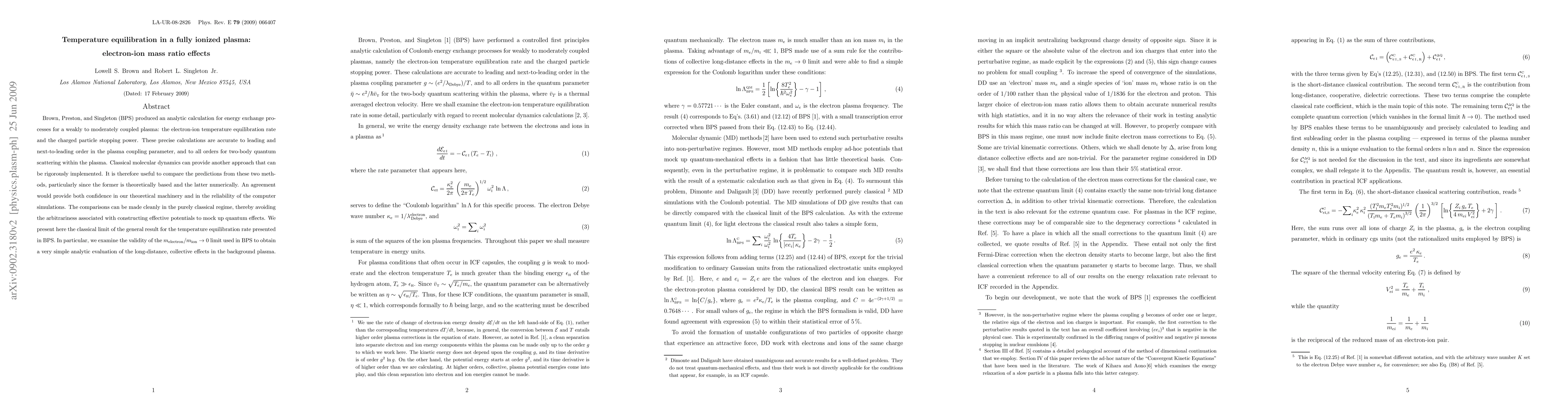 Brown, Preston, and Singleton (BPS) produced an analytic calculation for energy exchange processes for a weakly to moderately coupled plasma: the electron-ion temperature equilibration rate and the charged particle stopping power. These precise calculations are accurate to leading and next-to-leading order in the plasma coupling parameter, and to all orders for two-body quantum scattering within the plasma. Classical molecular dynamics can provide another approach that can be rigorously implemented. It is therefore useful to compare the predictions from these two methods, particularly since the former is theoretically based and the latter numerically. An agreement would provide both confidence in our theoretical machinery and in the reliability of the computer simulations. The comparisons can be made cleanly in the purely classical regime, thereby avoiding the arbitrariness associated with constructing effective potentials to mock up quantum effects. We present here the classical limit of the general result for the temperature equilibration rate presented in BPS. We examine the validity of the m_electron/m_ion --> 0 limit used in BPS to obtain a very simple analytic evaluation of the long-distance, collective effects in the background plasma.