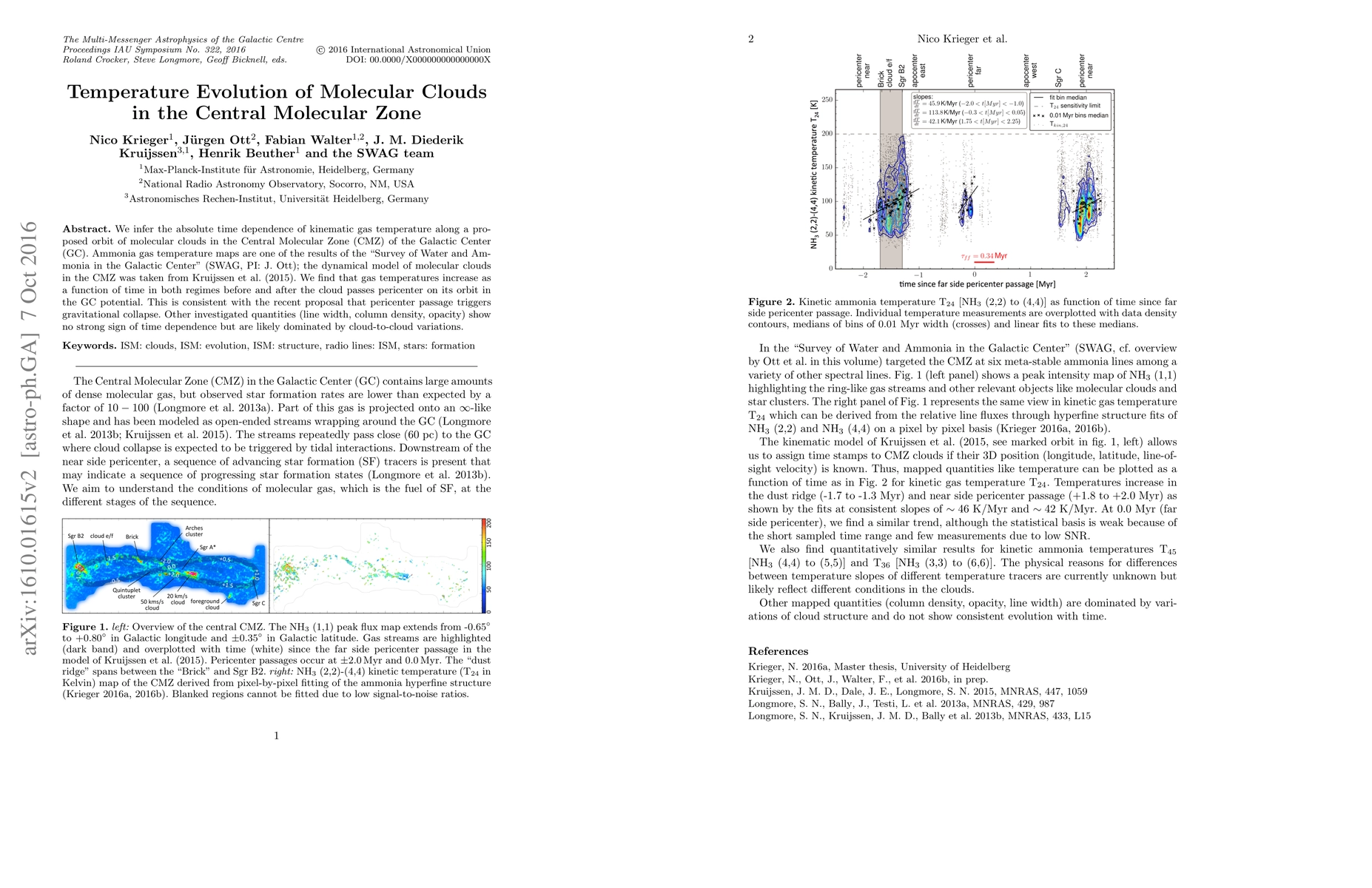 We infer the absolute time dependence of kinematic gas temperature along a proposed orbit of molecular clouds in the Central Molecular Zone (CMZ) of the Galactic Center (GC). Ammonia gas temperature maps are one of the results of the "Survey of Water and Ammonia in the Galactic Center" (SWAG, PI: J. Ott); the dynamical model of molecular clouds in the CMZ was taken from Kruijssen et al. (2015). We find that gas temperatures increase as a function of time in both regimes before and after the cloud passes pericenter on its orbit in the GC potential. This is consistent with the recent proposal that pericenter passage triggers gravitational collapse. Other investigated quantities (line width, column density, opacity) show no strong sign of time dependence but are likely dominated by cloud-to-cloud variations.