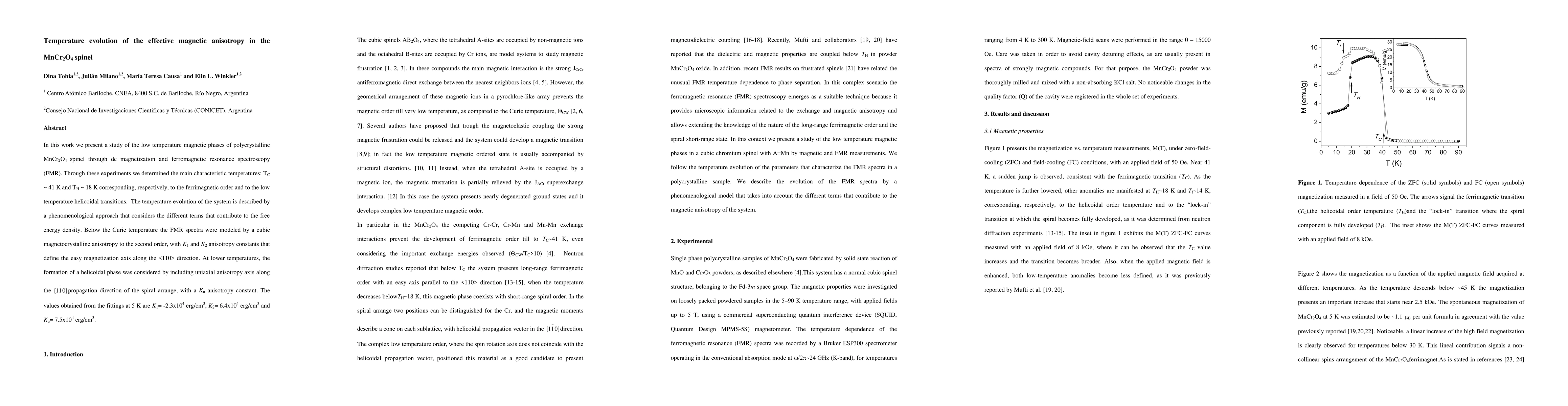 In this work we present a study of the low temperature magnetic phases of polycrystalline MnCr$_2$O$_4$ spinel through dc magnetization and ferromagnetic resonance spectroscopy (FMR). Through these experiments we determined the main characteristic temperatures: T$_C$ $\sim$41 K and T$_H$ $\sim$18 K corresponding, respectively, to the ferrimagnetic order and to the low temperature helicoidal transitions. The temperature evolution of the system is described by a phenomenological approach that considers the different terms that contribute to the free energy density. Below the Curie temperature the FMR spectra were modeled by a cubic magnetocrystalline anisotropy to the second order, with $K_1$ and $K_2$ anisotropy constants that define the easy magnetization axis along the <110> direction. At lower temperatures, the formation of a helicoidal phase was considered by including uniaxial anisotropy axis along the [1-10] propagation direction of the spiral arrange, with a $K_u$ anisotropy constant. The values obtained from the fittings at 5 K are $K_1$=-2.3x10$^4$ erg/cm$^3$, $K^2$=6.4x10$^4$ erg/cm$^3$ and $K_u$=7.5x10$^4$ erg/cm$^3$.
