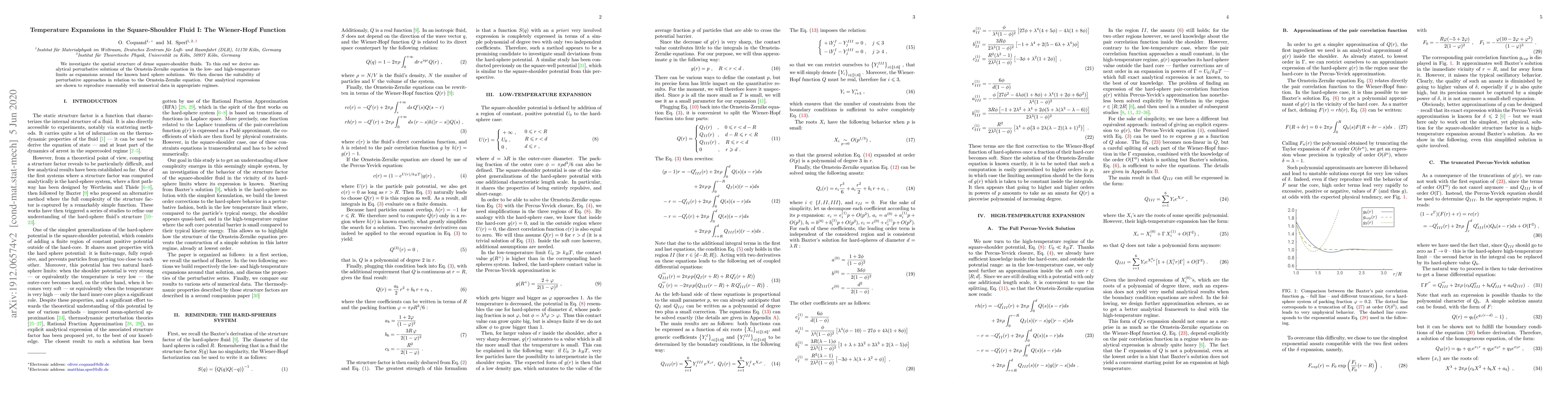 This paper derives analytical perturbative solutions for the spatial structure of dense square-shoulder fluids, focusing on low- and high-temperature limits using the Wiener-Hopf function. It evaluates the effectiveness of perturbative methods in solving the Ornstein-Zernike equation for these conditions.