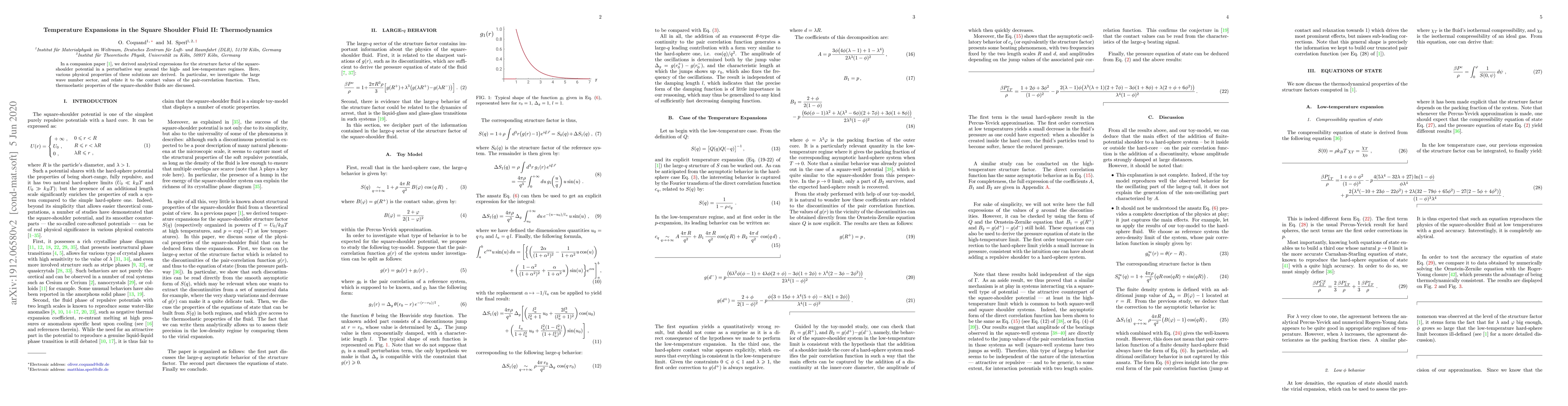 Researchers investigated thermodynamic properties of square-shoulder fluids at high and low temperatures, focusing on large wave number sectors and their relation to pair-correlation functions, with implications for thermoelastic behavior.