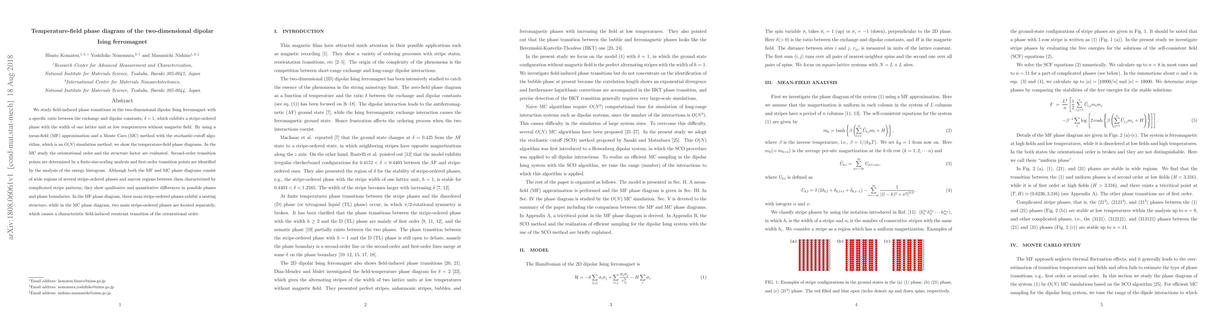 This paper investigates field-induced phase transitions in a two-dimensional dipolar Ising ferromagnet using mean-field and Monte Carlo methods, revealing qualitative and quantitative differences in the resulting temperature-field phase diagrams, including a characteristic reentrant transition in the Monte Carlo study.