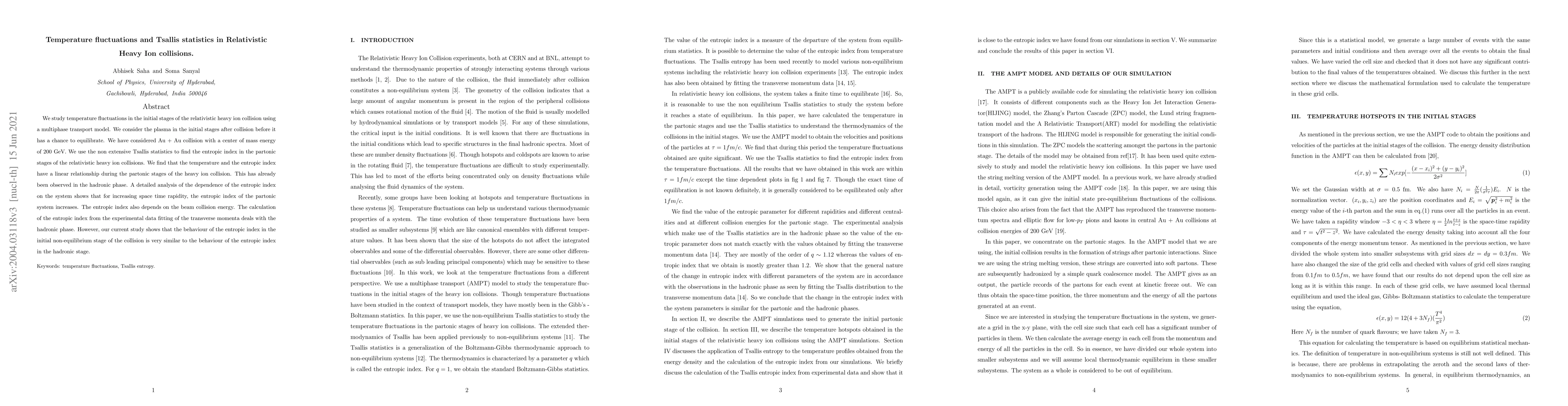 This study investigates temperature fluctuations in the initial stages of relativistic heavy ion collisions using a multiphase transport model, revealing a linear relationship between temperature and the entropic index derived from Tsallis statistics during partonic stages. The entropic index shows a dependence on space-time rapidity and beam collision energy, mirroring its behavior in the hadronic phase.