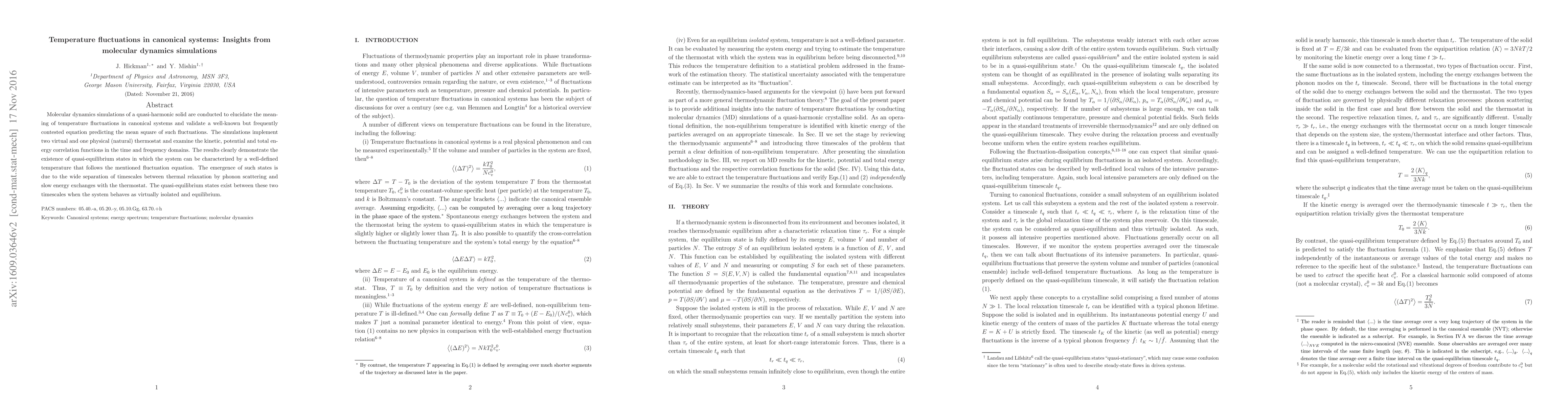 Molecular dynamics simulations of a quasi-harmonic solid are conducted to elucidate the meaning of temperature fluctuations in canonical systems and validate a well-known but frequently contested equation predicting the mean square of such fluctuations. The simulations implement two virtual and one physical (natural) thermostat and examine the kinetic, potential and total energy correlation functions in the time and frequency domains. The results clearly demonstrate the existence of quasi-equilibrium states in which the system can be characterized by a well-defined temperature that follows the mentioned fluctuation equation. The emergence of such states is due to the wide separation of timescales between thermal relaxation by phonon scattering and slow energy exchanges with the thermostat. The quasi-equilibrium states exist between these two timescales when the system behaves as virtually isolated and equilibrium.