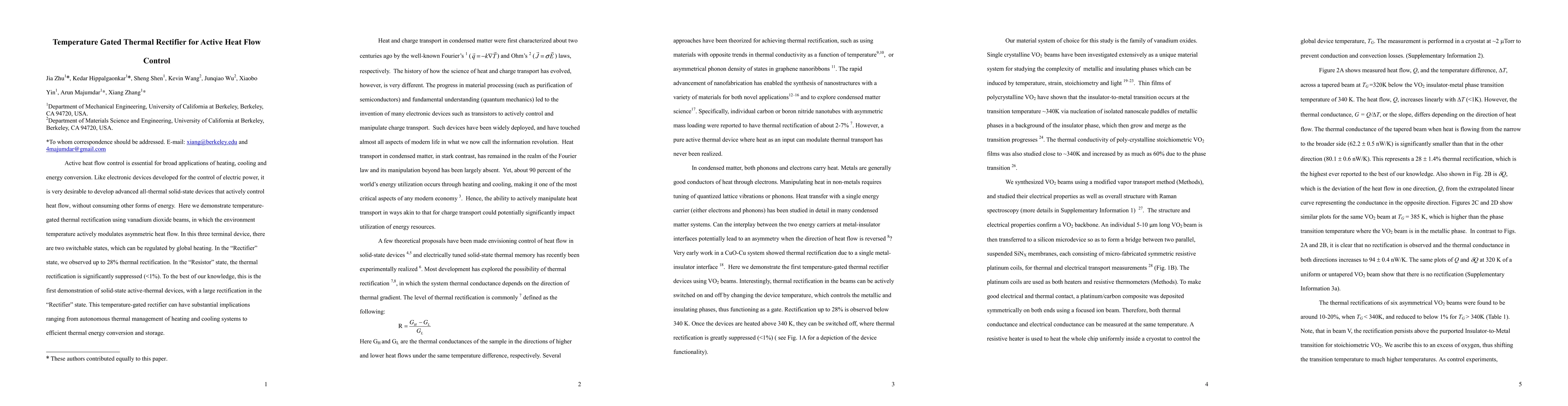 This paper reports the first observation of temperature-gated thermal rectification in vanadium dioxide beams, demonstrating up to 28% asymmetric heat flow in the Rectifier state and significantly reduced rectification in the Resistor state. This device has potential applications in autonomous thermal management and thermal energy conversion.