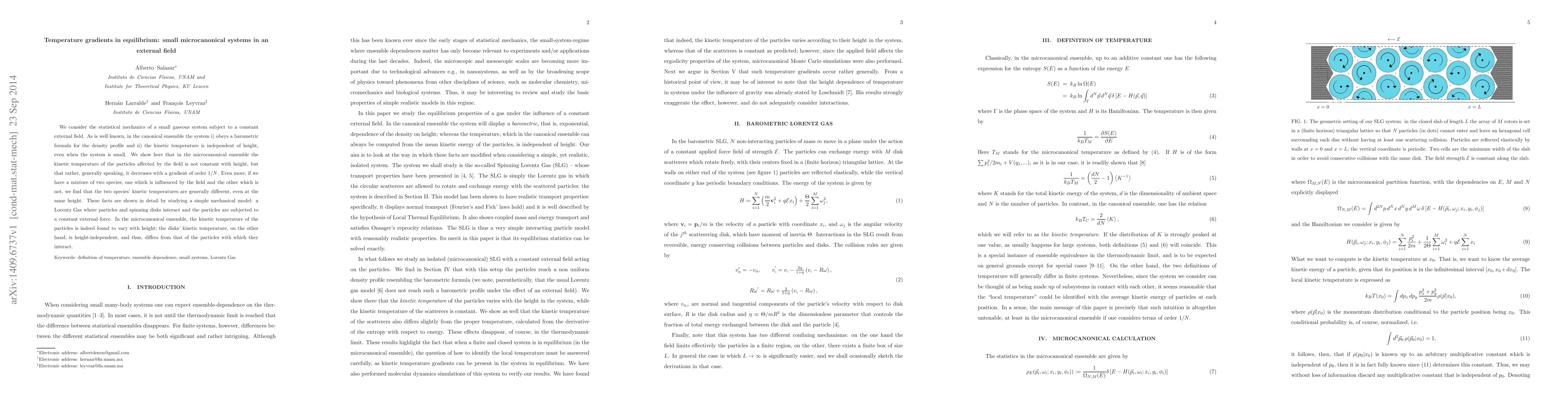 We consider the statistical mechanics of a small gaseous system subject to a constant external field. As is well known, in the canonical ensemble the system i) obeys a barometric formula for the density profile and ii) the kinetic temperature is independent of height, even when the system is small. We show here that in the microcanonical ensemble the kinetic temperature of the particles affected by the field is not constant with height, but that rather, generally speaking, it decreases with a gradient of order 1/N. Even more, if we have a mixture of two species, one which is influenced by the field and the other which is not, we find that the two species' kinetic temperatures are generally different, even at the same height. These facts are shown in detail by studying a simple mechanical model: a Lorentz Gas where particles and spinning disks interact and the particles are subjected to a constant external force. In the microcanonical ensemble, the kinetic temperature of the particles is indeed found to vary with height; the disks' kinetic temperature, on the other hand, is height-independent, and thus, differs from that of the particles with which they interact.