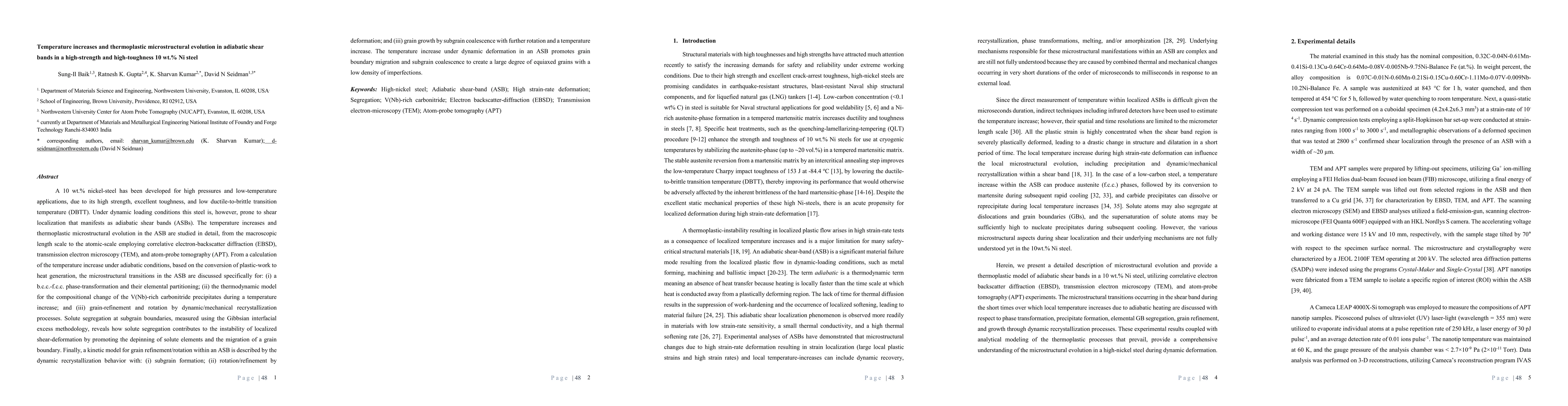 This paper investigates the temperature increases and thermoplastic microstructural evolution in adiabatic shear bands (ASBs) of a high-strength 10 wt.% Ni steel under dynamic loading. It employs advanced microscopy techniques to study microstructural transitions, including phase transformations, precipitate compositional changes, and grain refinement via dynamic recrystallization, revealing the mechanisms of solute segregation and grain boundary migration.