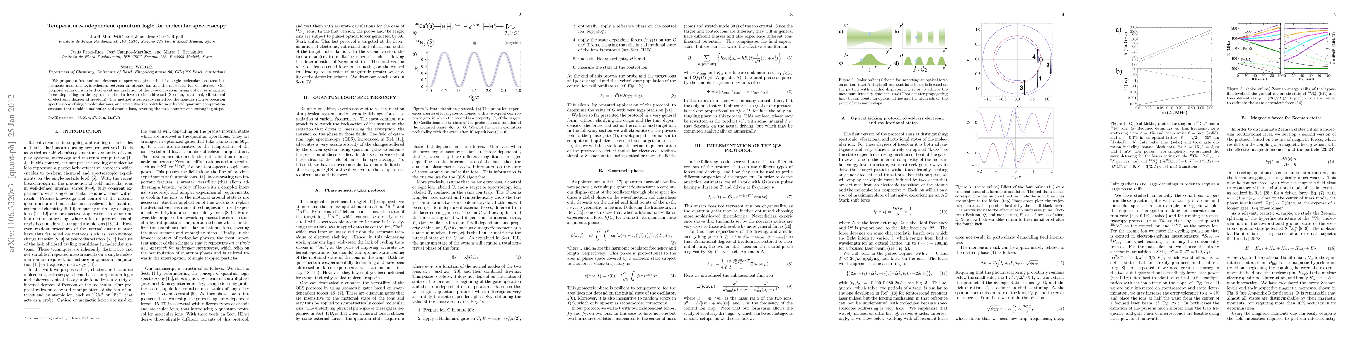 We propose a fast and non-destructive spectroscopic method for single molecular ions that implements quantum logic schemes between an atomic ion and the molecular ion of interest. Our proposal relies on a hybrid coherent manipulation of the two-ion system, using optical or magnetic forces depending on the types of molecular levels to be addressed (Zeeman, rotational, vibrational or electronic degrees of freedom). The method is especially suited for the non-destructive precision spectroscopy of single molecular ions, and sets a starting point for new hybrid quantum computation schemes that combine molecular and atomic ions, covering the measurement and entangling steps.